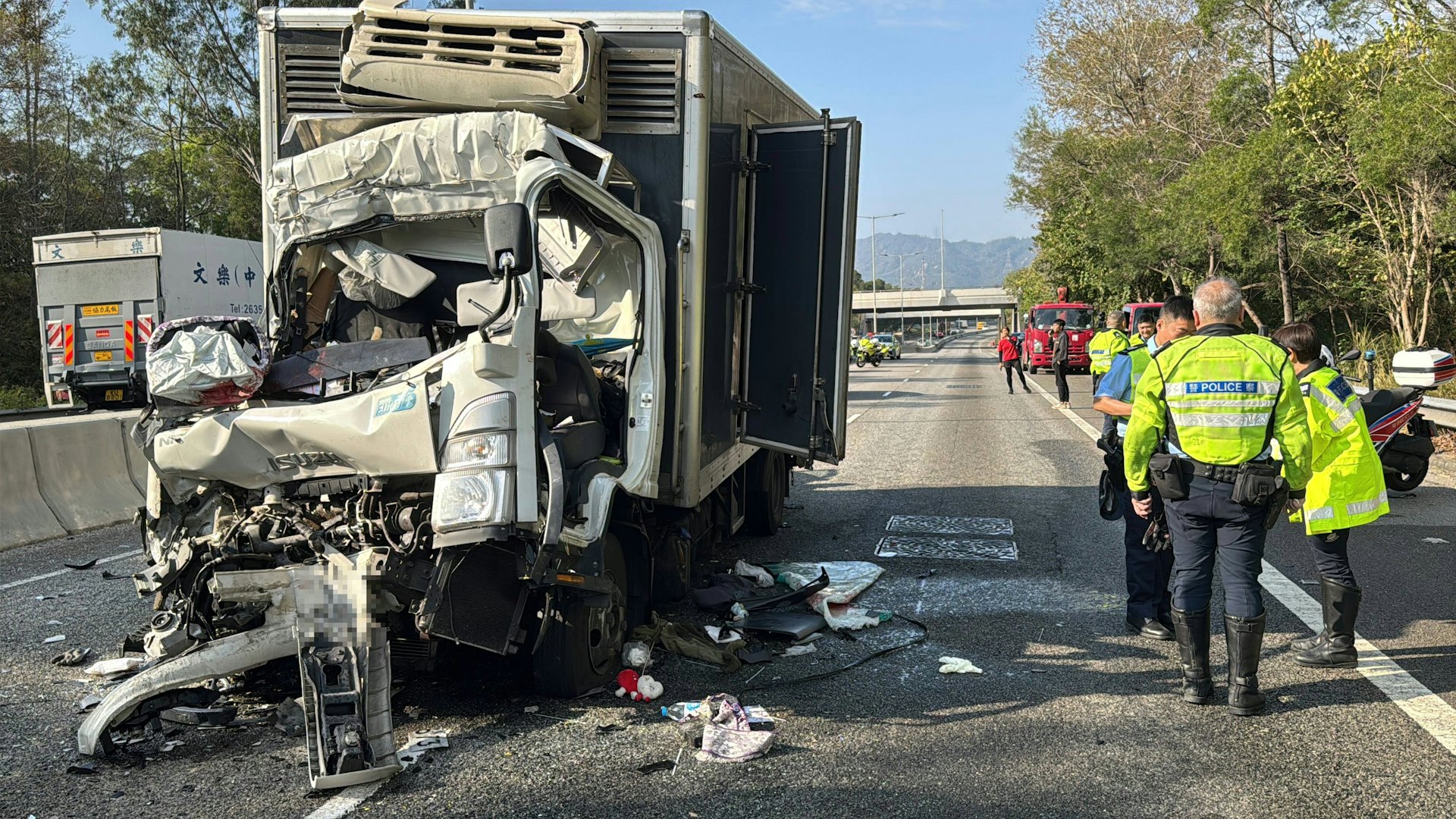 6 y$ z6 X" j$ e% s涉事冷藏貨車車頭毀爛不堪,軚盤位置染血。(蔡正邦攝)
