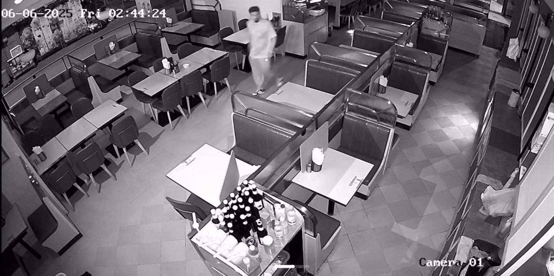 現場閉路電視拍攝到,凌晨約2時44分,一名身穿短袖長褲、手持電筒的非華裔男子進入餐廳,他並無佩戴口罩,在店內四處走動及張望,其後走到收銀機位置,試圖取出金錢,又打開多個櫃桶作搜掠。整個犯案過程約1分半鐘,男賊事後從側門逃離。
