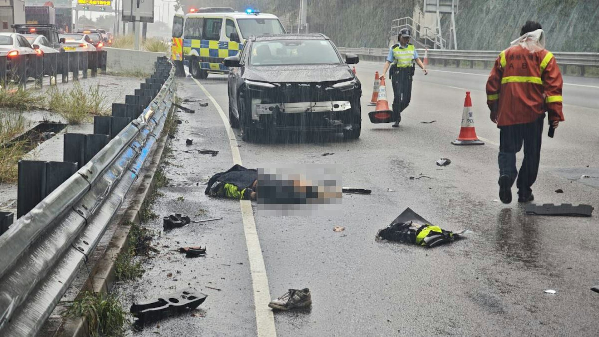 5 }) ~/ \% J3 w9 ?: G. Y- _現場是青沙公路出九龍方向,距離管道約300米位置。消息指,事發時電單車「綿羊仔」曾停在慢線旁邊的路肩,再駛回慢線時,尾隨駛至的拖頭收掣不及將之撞到。拖頭繼而扭軚,連人帶車將電單車由慢線拖到快線;拖頭再撞沿快線駛至的一輛私家車。