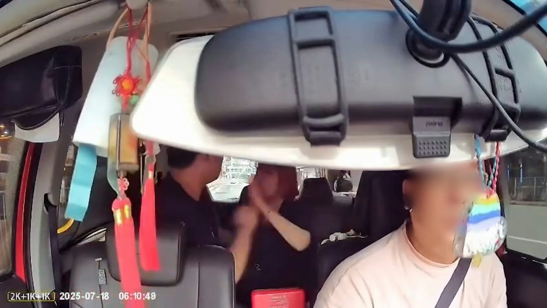 . t/ J1 u2 N- I0 ^3 q該段在網上流傳、相信是「小露寶」的士的車內cam片,畫面顯示是拍攝於今日清晨6時許。片中可見,當時後座有一名金啡長髮女乘客,正當車門自動關上之際,一名鴨舌帽的男子突然登車,未及女方移動位置,便一手大力猛推,女子猝不及防,整個人翻倒座位上,疑撞及面部,一度手掩臉龐,隨即揮左手「兜巴星」向男方,她一度再出手,被男子擋住。