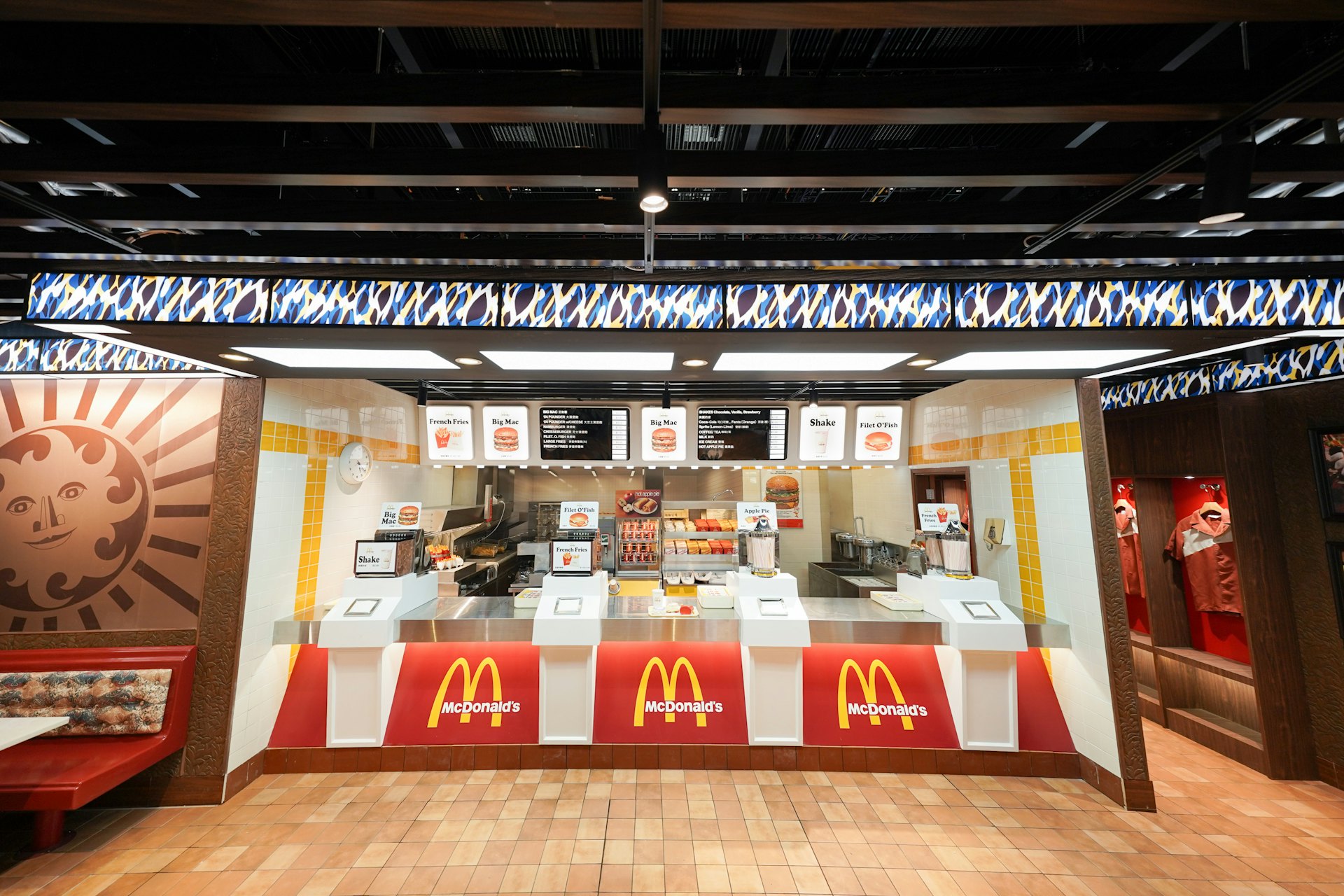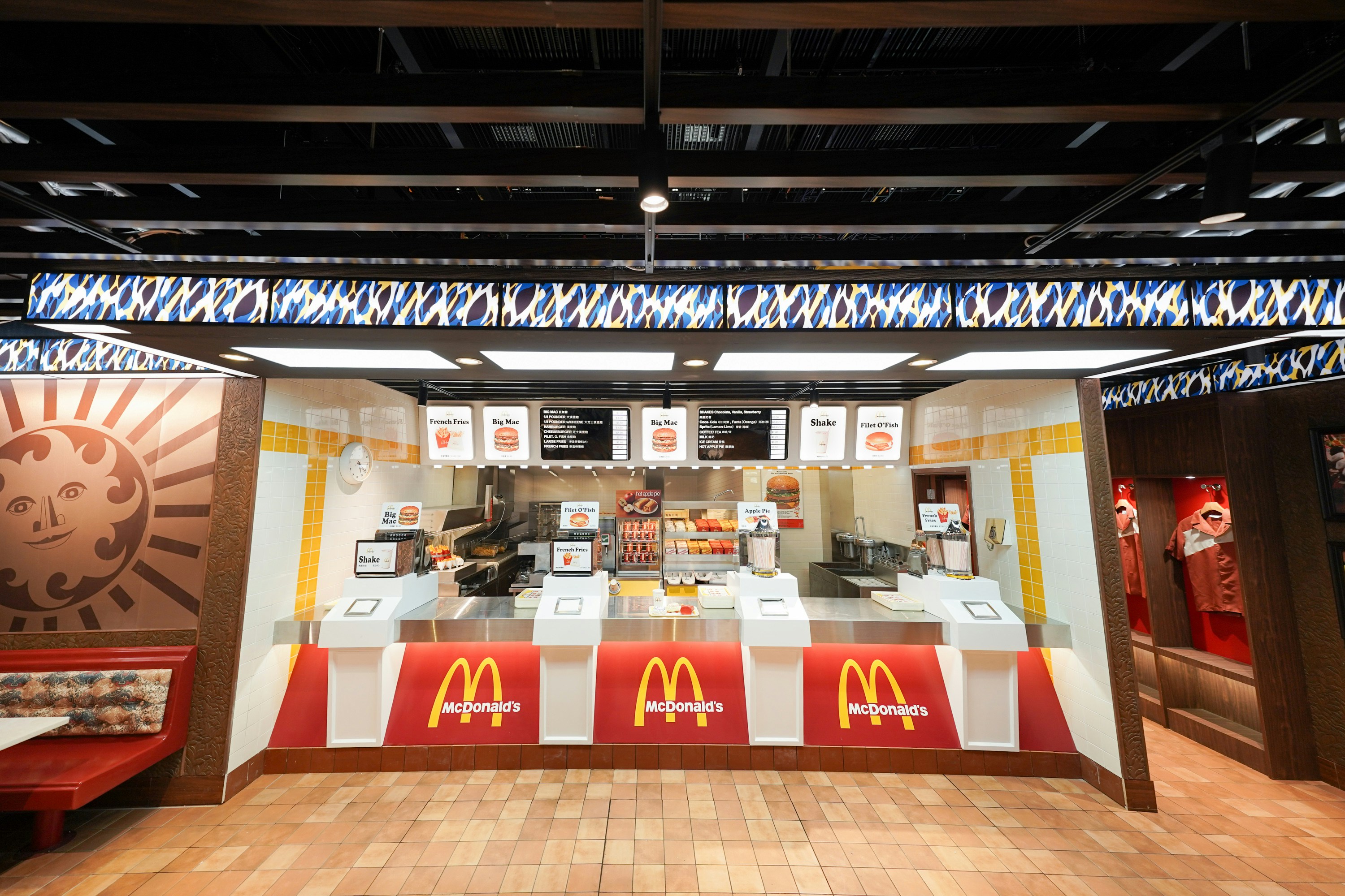 8 W$ T; R8 u. z( \TVBNOW 含有熱門話題,最新最快電視,軟體,遊戲,電影,動漫及日常生活及興趣交流等資訊。重現1975年的餐牌燈箱、收銀機、啡色地磚、卡位座位等。(麥當勞提供圖片)