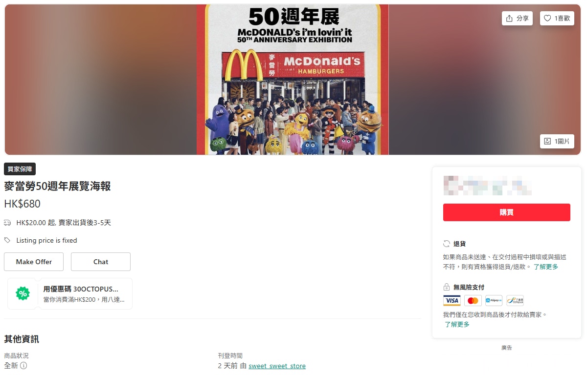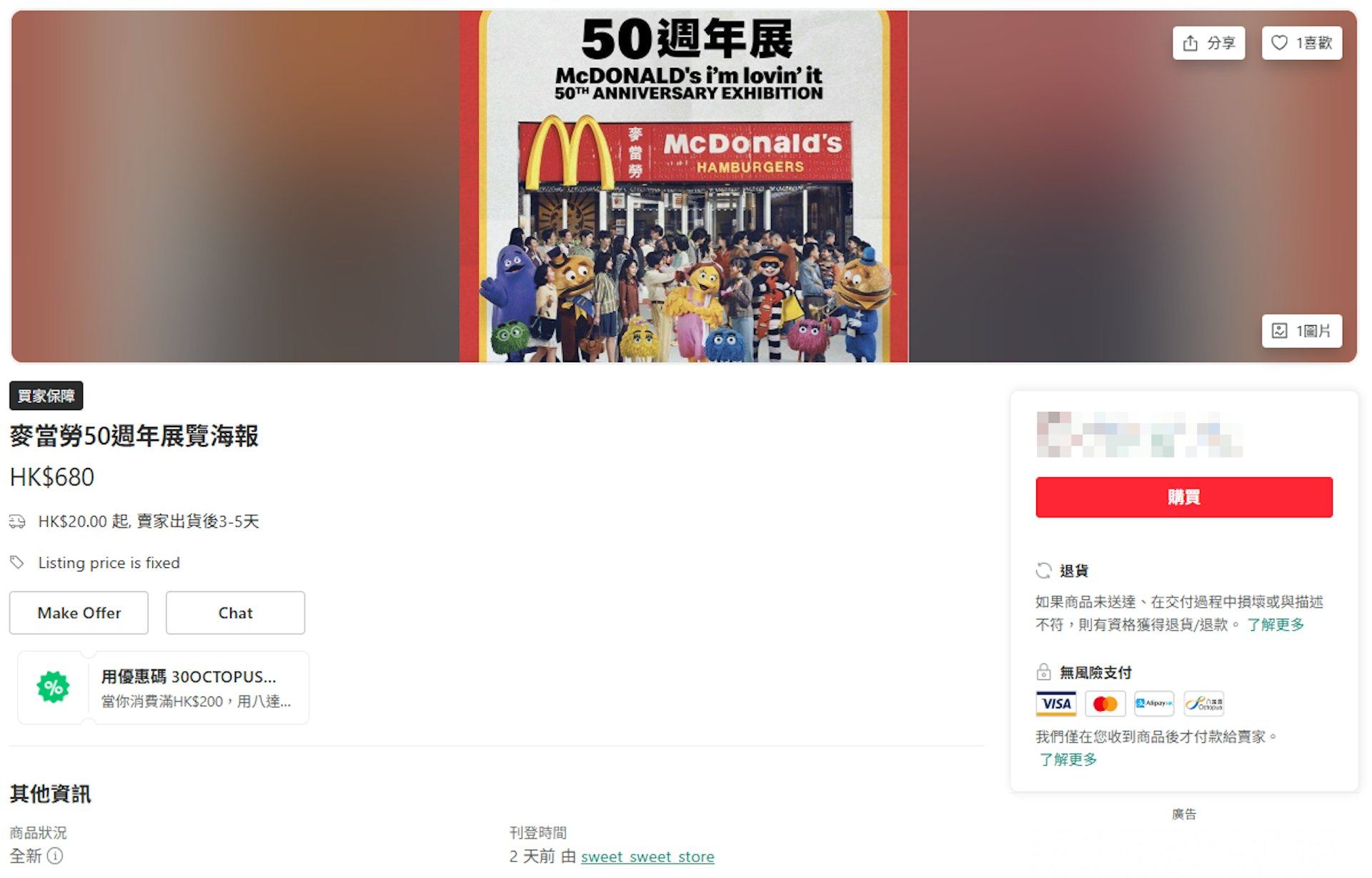 2 u( h# X5 i' n& K) T麥當勞50周年展覽海報索價680元。(網頁截圖)os.tvboxnow.com2 b' n) b1 M6 b. U