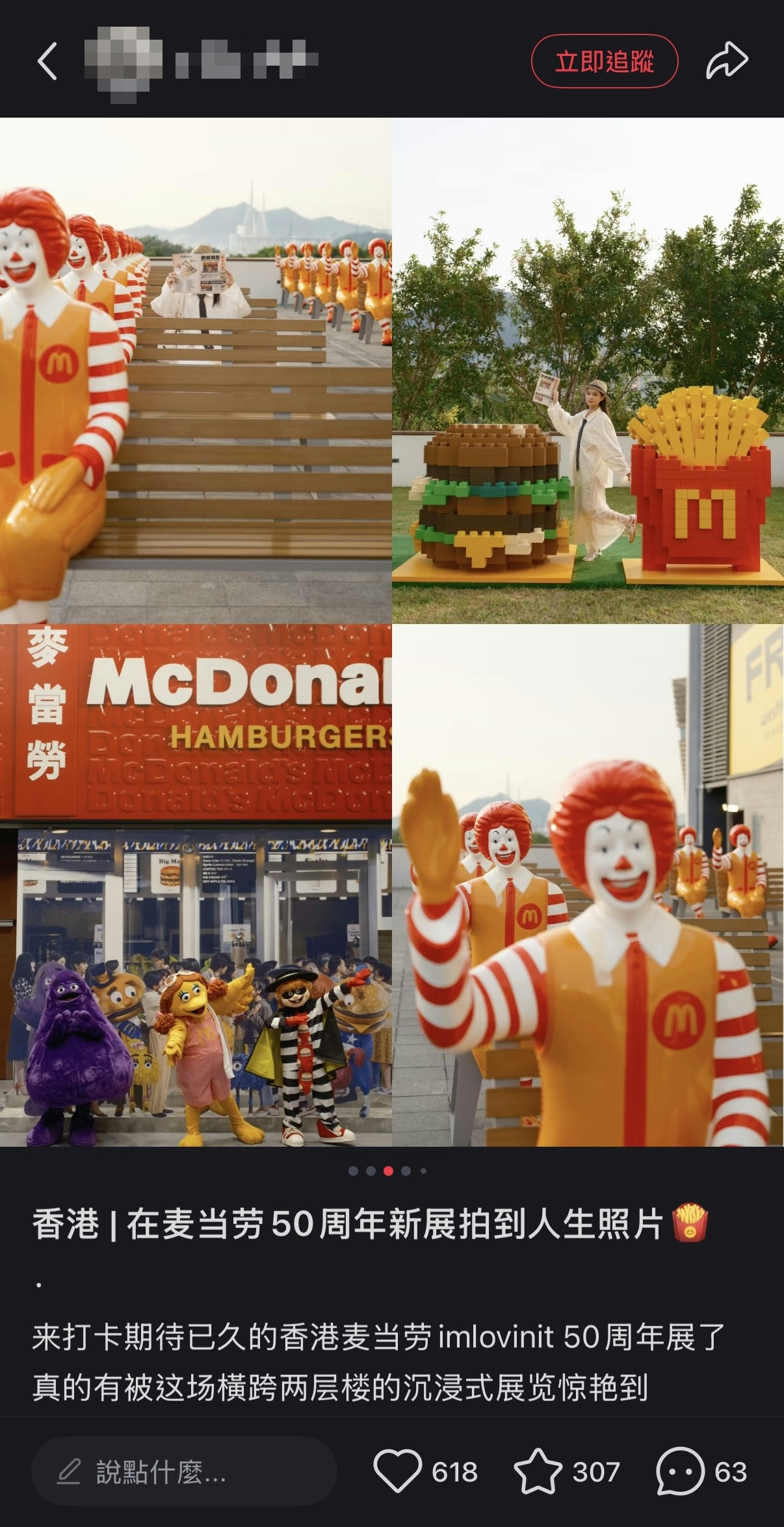 此外,內地社交平台小紅書也有不少帖文推介麥當勞展覽,例如有內地旅客十一黃金周訪港,並以「在麥當勞50周年新展拍到人生照片」為題,撰文發表感受,獲得618個讚好。她表示滿滿的童年回憶湧上心頭,形容為情懷感拉滿,並推薦其他用戶訪港必須前來體驗,「真的有被這場兩層樓的沉浸式展覽驚艷到。」 |