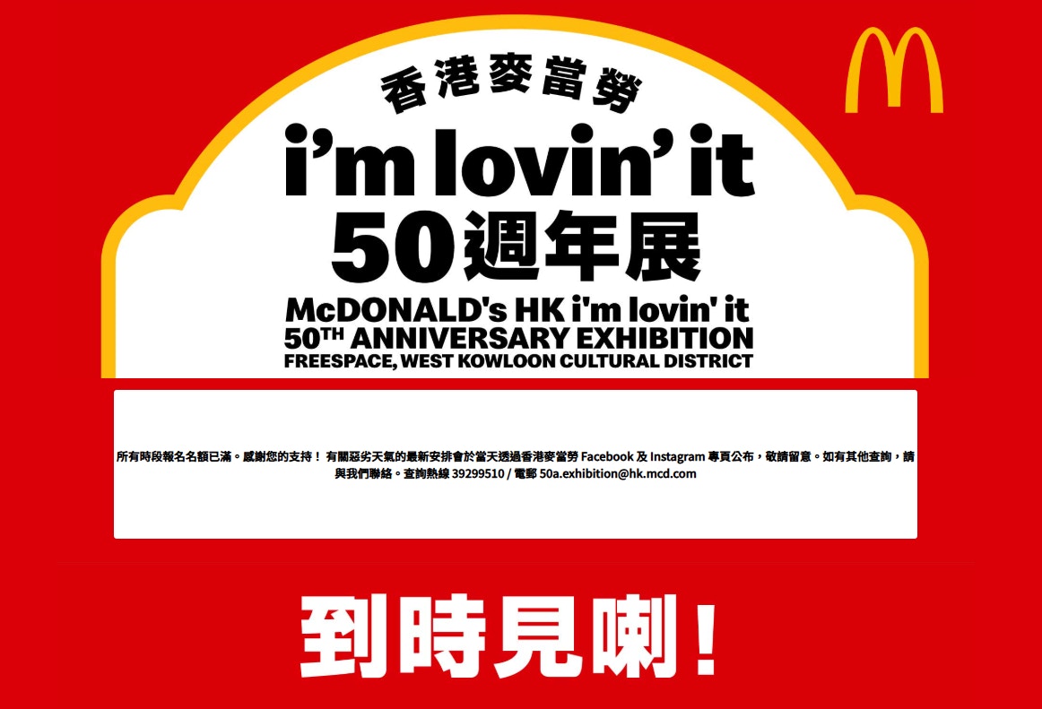 香港麥當勞50周年展覽在西九文化區自由空間舉行,展期為10月1日至10月19日,橫跨十一黃金周及中秋節,為香港麥當勞史上最大規模的主題展覽,由5個主題展區組成,佔地逾7,000平方呎,展出歷代宣傳海報、包裝、開心樂園餐玩具、餐廳設計等,帶港人穿越半世紀,重溫50年以來的集體回憶。8 i Z2 d: l; ~+ H' C. Z! G