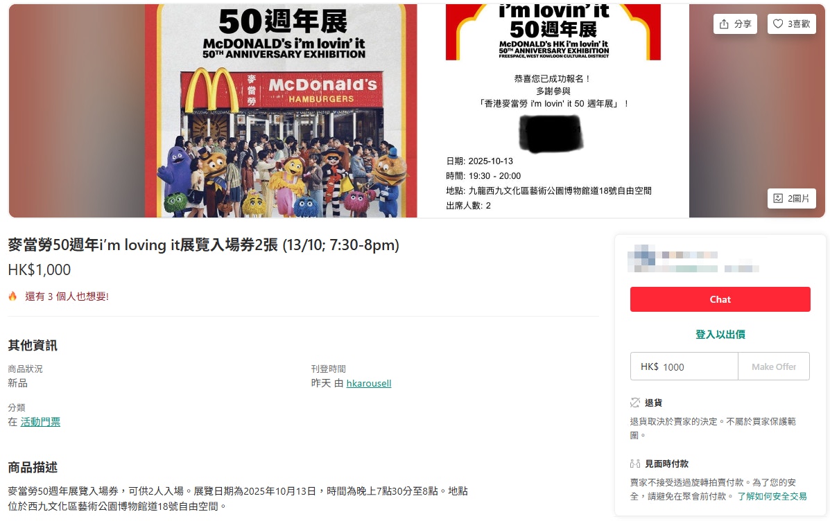 門票上月正式開賣後,所有進場時段都火速售罄,一票難求。翻查網上拍賣平台Carousell,原來有不少粉絲未能搶得適合日期或時段的門票,例如有粉絲為了在公眾假期(7日、中秋節翌日)進場觀賞展覽,開價2,000元徵收兩張門票,即1,000元一張。