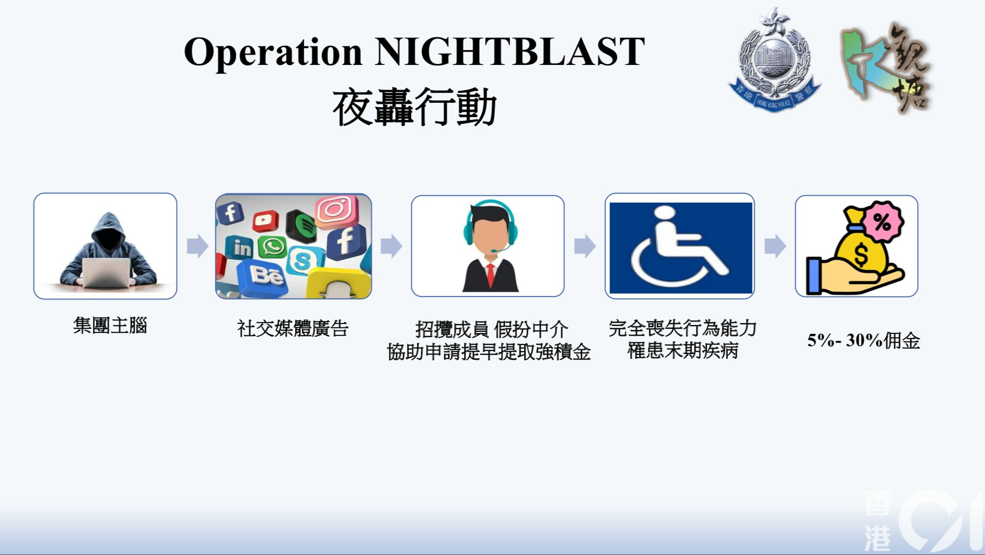 觀塘警區重案組第一隊督察梁曼宜指,調查顯示,有犯罪集團主腦假扮成中介,透過社交媒體上的廣告接觸被捕人,聲稱可以安排中介,幫被捕人提早取回強積金供款。實際上,有關中介會協助被捕人向強積金受託人公司,提交虛假的醫生證明,聲稱完全喪失行為能力或罹患末期疾病,目的為提早取回強積金供款。2 O* O" p- F. L" a, _) E: E