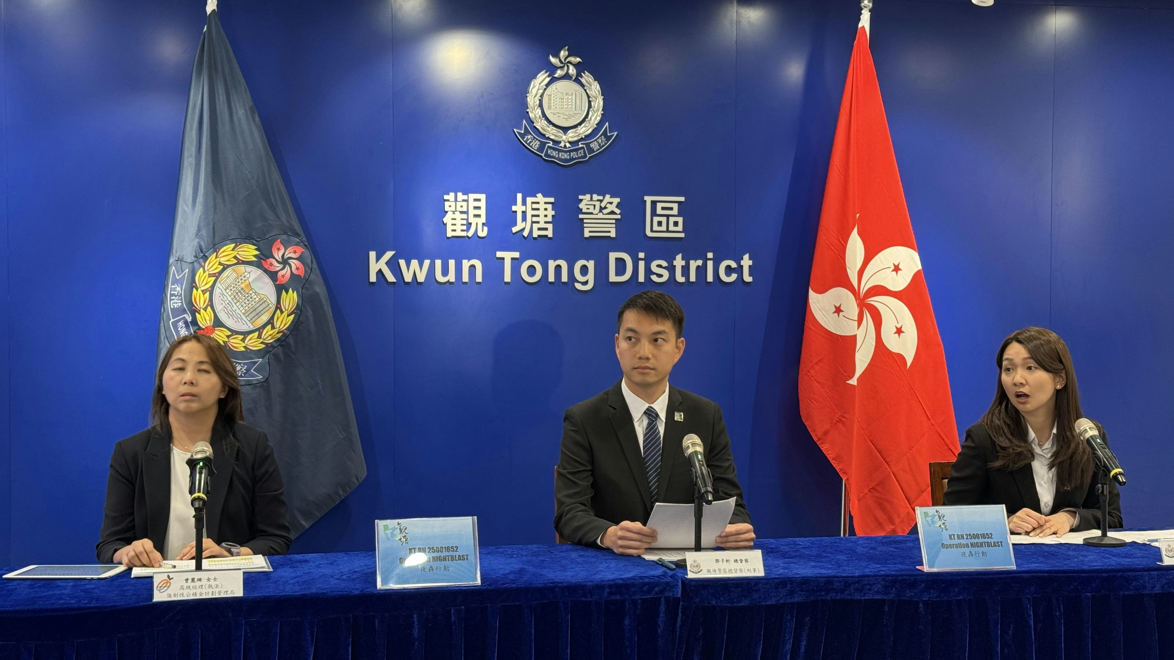 積金局高級經理(執法)曾麗珊(左)、觀塘警區刑事總督察鄧子軒(中)、重案組第一隊督察梁曼宜(右)交代案件。(翁鈺輝攝) |