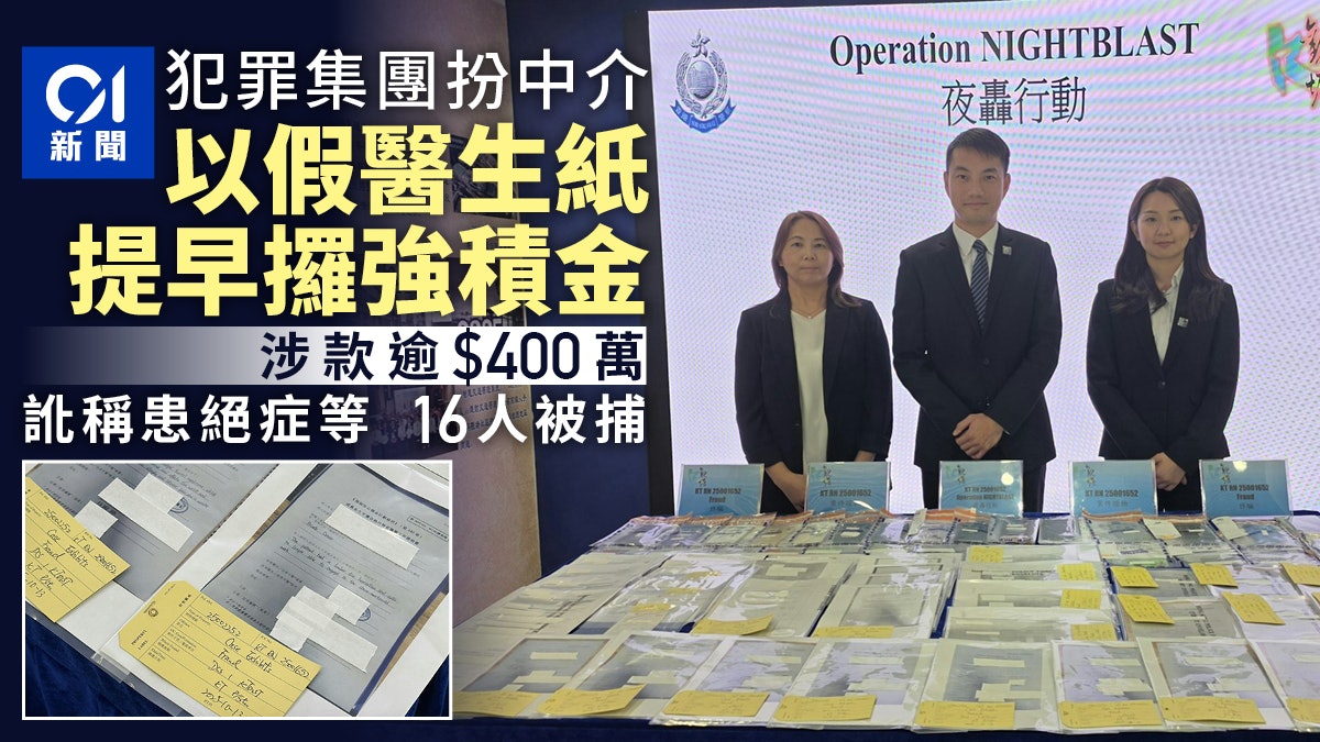 警方過去3日以涉嫌「欺詐罪」拘捕16名男女,有人因欠債、急需資金周轉等,成功提早領取合共超過港幣400萬元強積金。案中沒有醫生涉案。