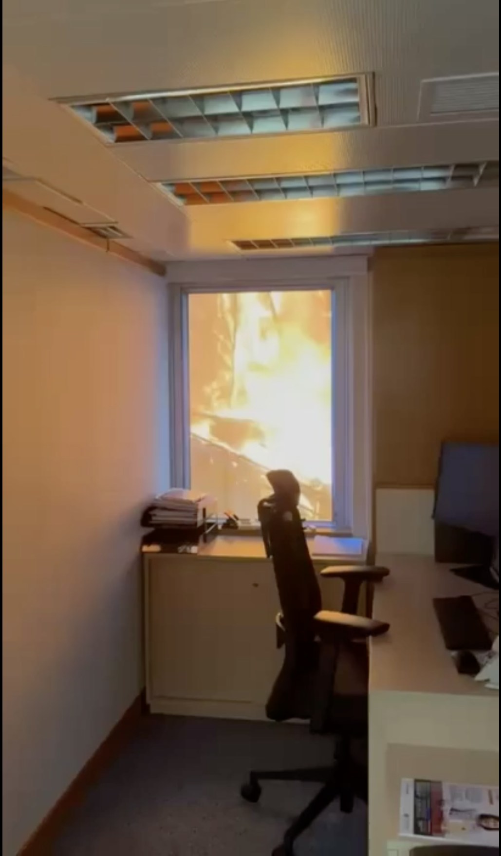 附近大廈辦公室的視角,被火海包圍。(threads@yanlyin)5 x9 z, h' z' F# J# Z! k' ?- g1 L' y7 k