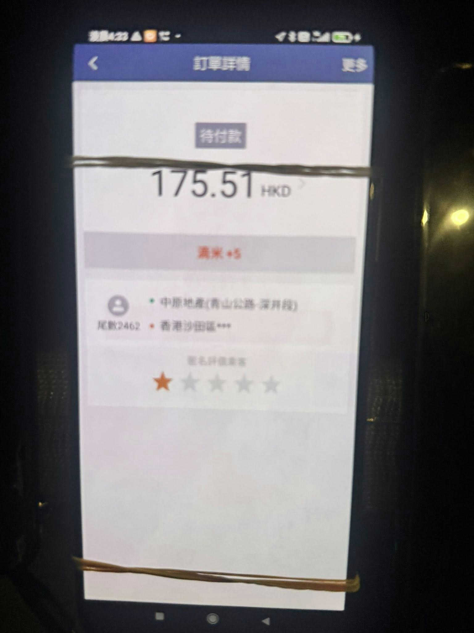 電召平台截圖見到,此程車資總共175.51元,標示了「待付款」。(Facebook群組「的士司機資訊網Taxi」)