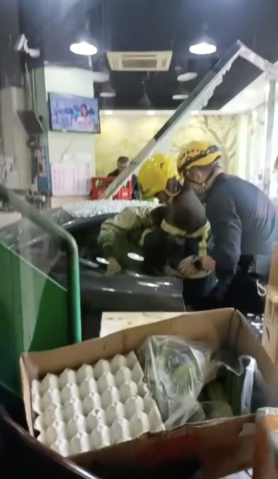 * I. B8 @. V1 G$ D% e: C2 I公仔箱論壇網上圖片可見,店面的玻璃大門被撞毁,碎片與碗碟散落一地。有目擊食客大驚:「食食下飯飛X咗架車入嚟......」另有影片可見,男司機被困車內,他企圖落車不果,最終由消防人員救出送院。公仔箱論壇1 k, |# R% u& Z# m8 [