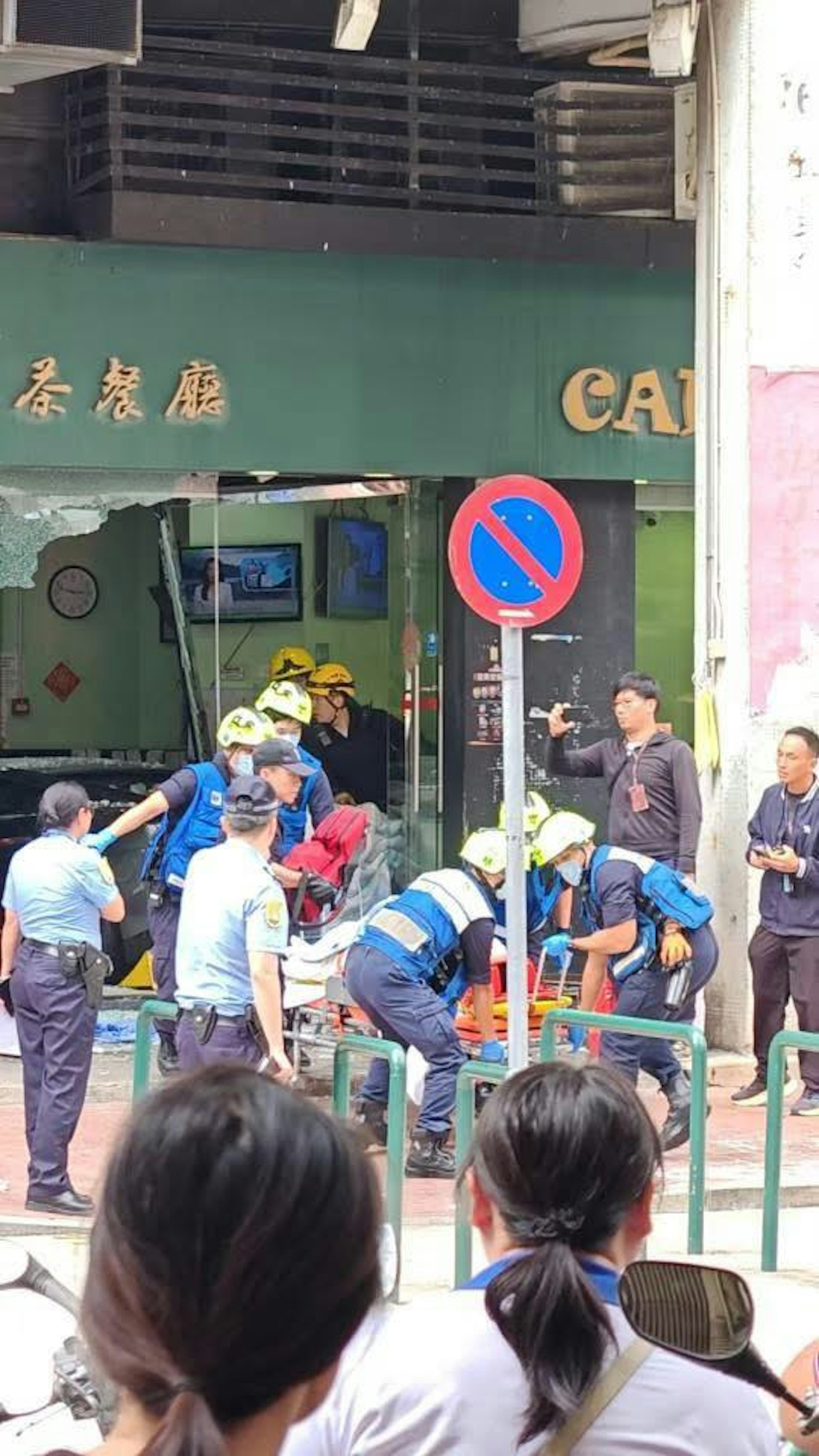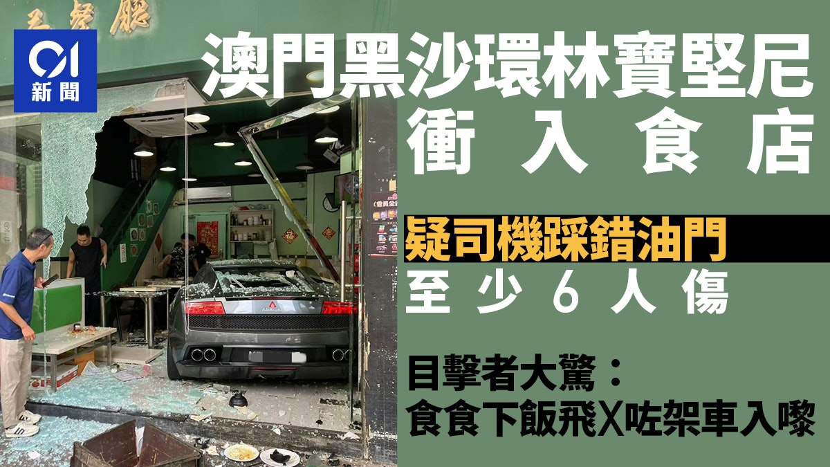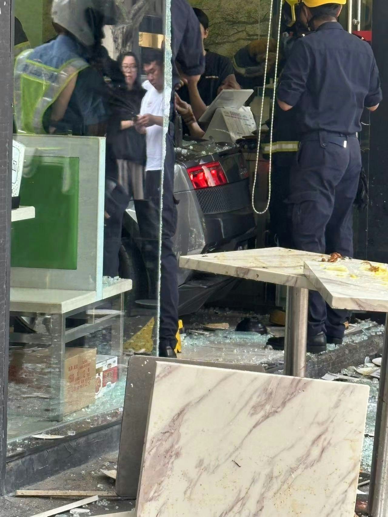 一輛林寶堅尼跑車高速衝入馬交石街廣華新邨的一間茶餐廳,6人受傷。(Facebook 澳門交通現場 / Ben Lio)