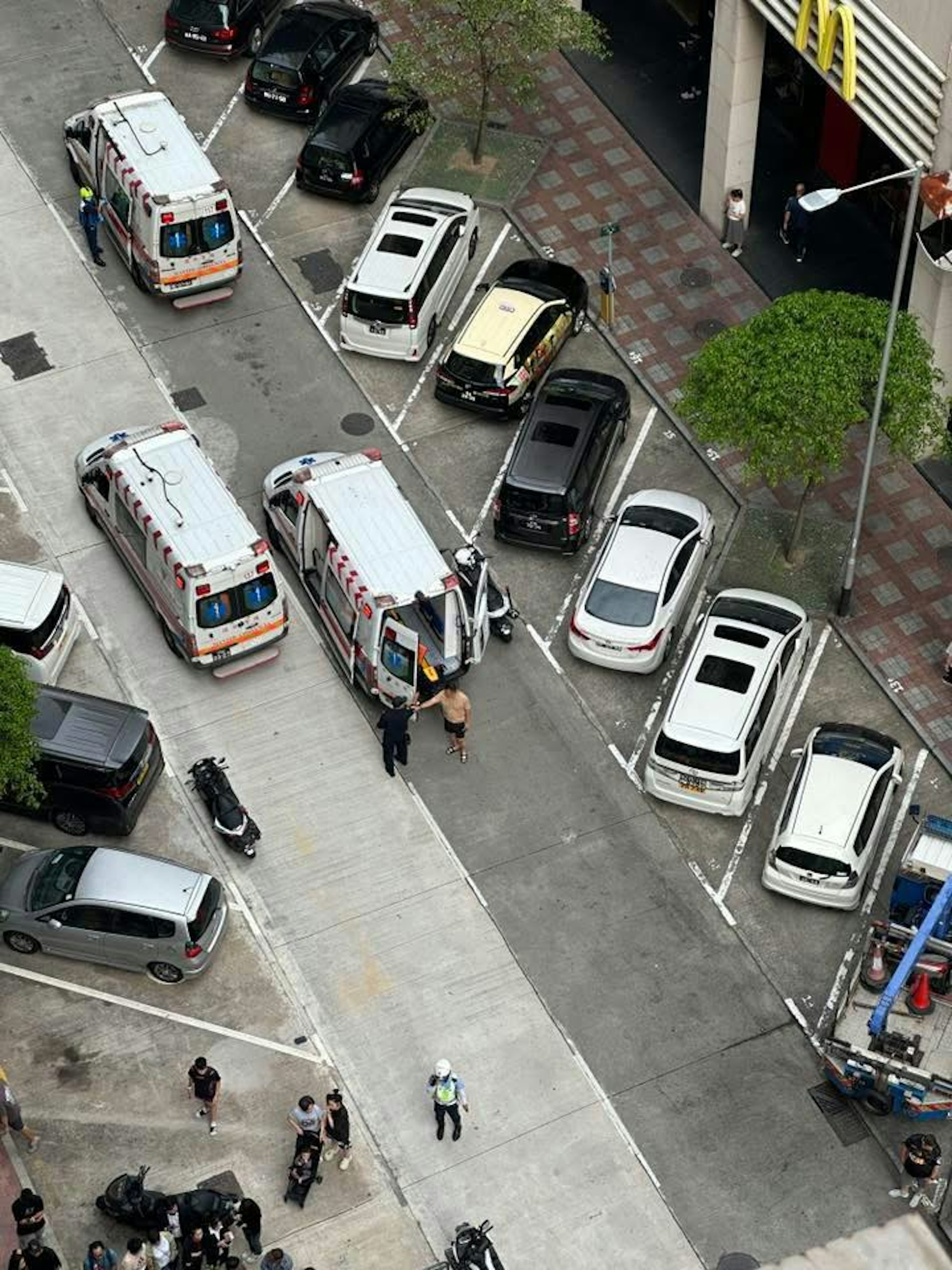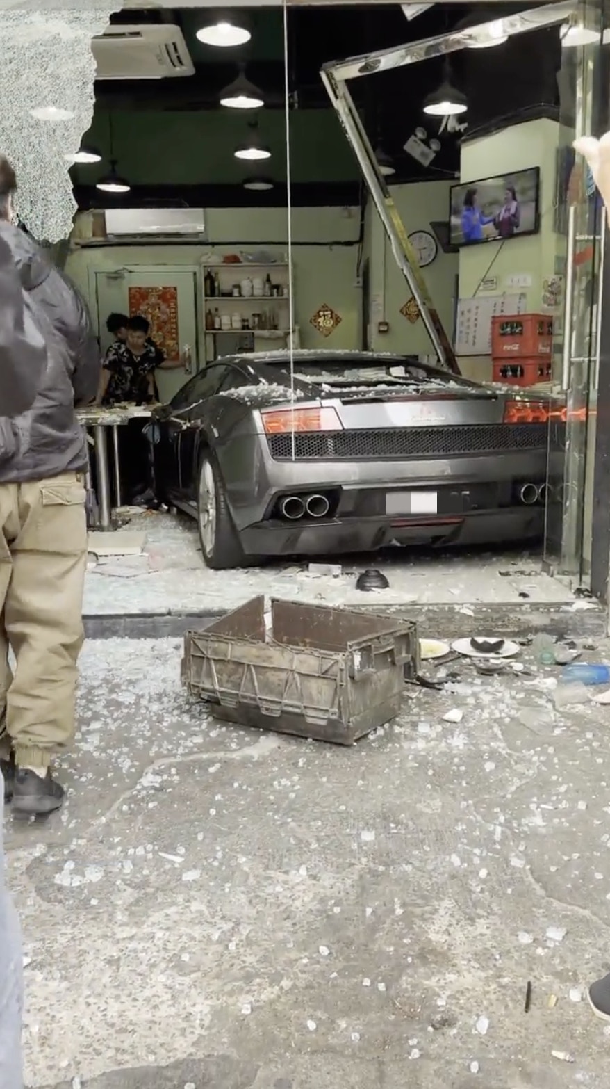 7 w4 j' M. u/ m" L公仔箱論壇一輛林寶堅尼跑車高速衝入馬交石街廣華新邨的一間茶餐廳,6人受傷。(小紅書 / 小隔壁小王 影片截圖)