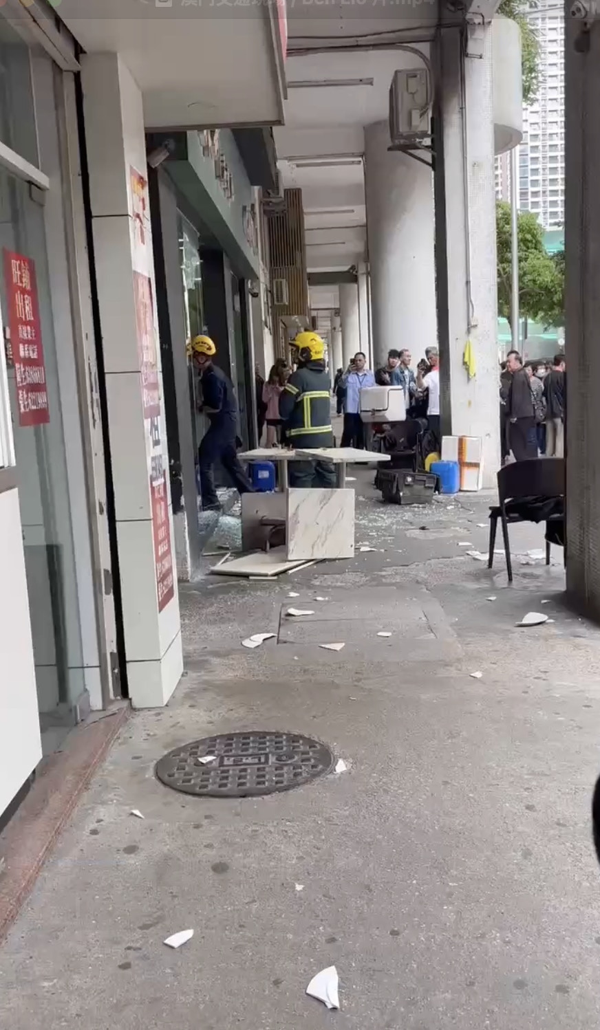 店面的玻璃大門被撞毁,碎片與碗碟散落一地。(Facebook 澳門高登起底組 / Chan Helen 影片截圖)7 p, d% a- F, L5 P6 d: k