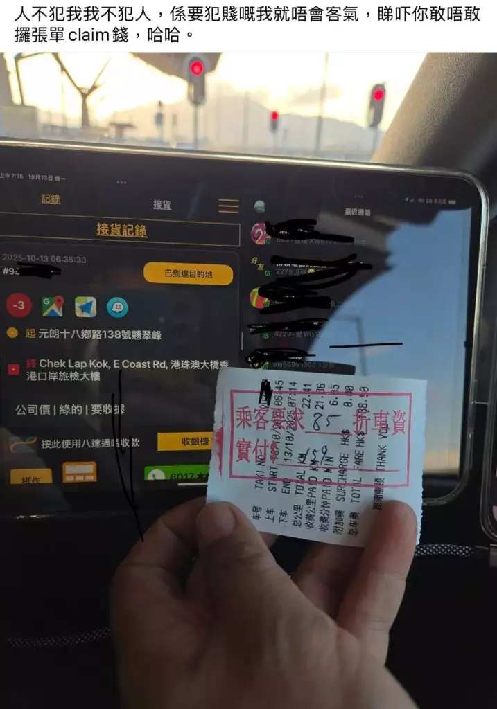 8 L2 V0 c* Z9 f, u9 `公仔箱論壇該名的士司機在網上發文,指有乘客為了「賺到盡」,會透過電召平台預約享有折扣的士,但在抵達目的地後,卻向公司申報正價車資,從而賺取當中的差價。司機直言此舉「犯賤」,更揚言「人不犯我我不犯人,係要犯賤嘅我就唔會客氣」。
