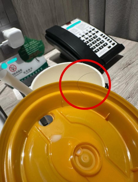 有港女北上出差住酒店,發現放枱面的飲品杯蓋離奇出現1條疑似體毛,懷疑被人「加料」。(「threads@ruby0327」圖片)tvb now,tvbnow,bttvb. D6 D" T. J/ r$ H- ~" c/ Q