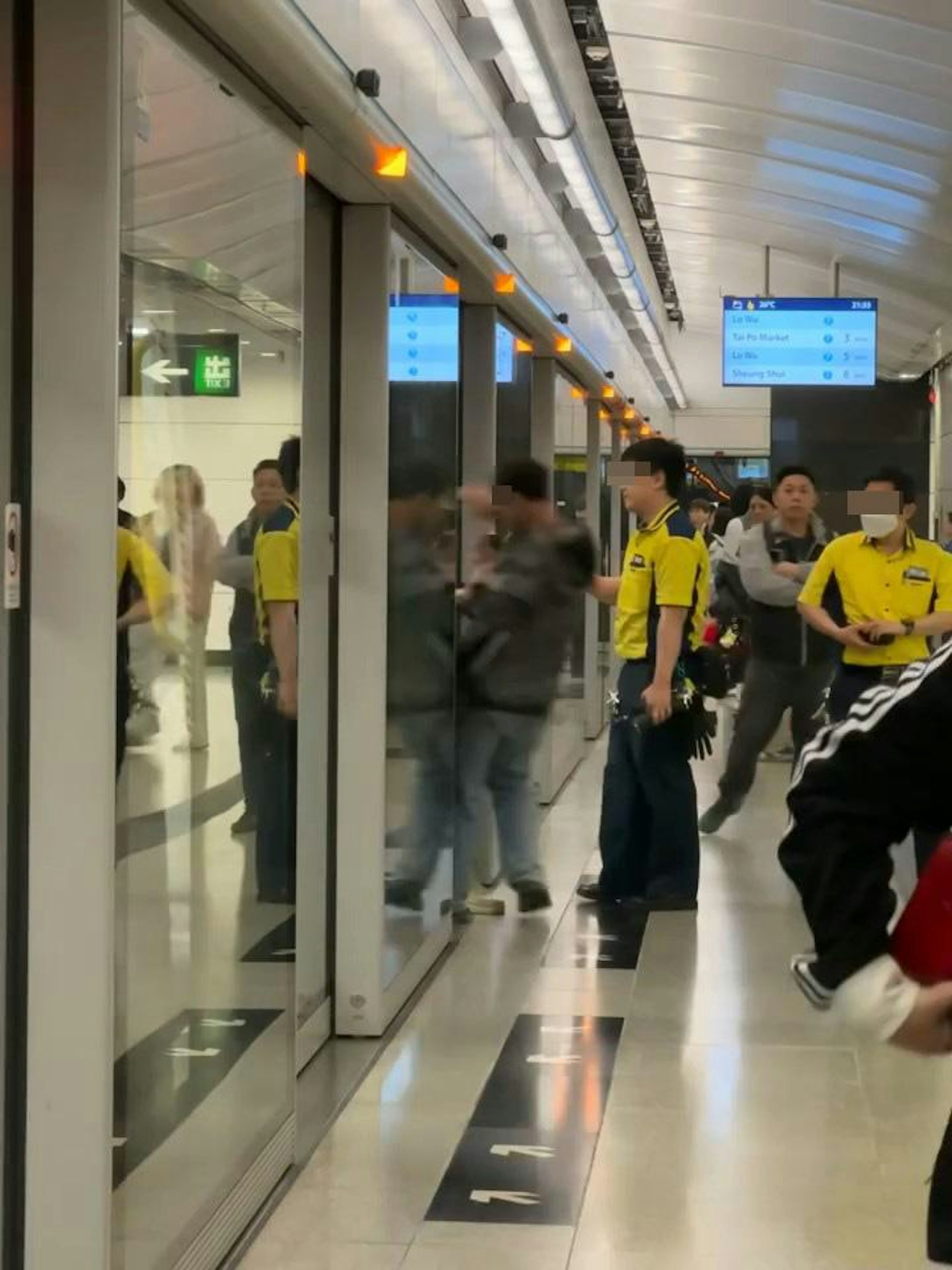 東鐵綫月台有1名疑似醉酒、穿灰色外套大叔阻擋車門關閉,並「爆粗」責罵車內乘客「X你老X」,有男職員在場處理。