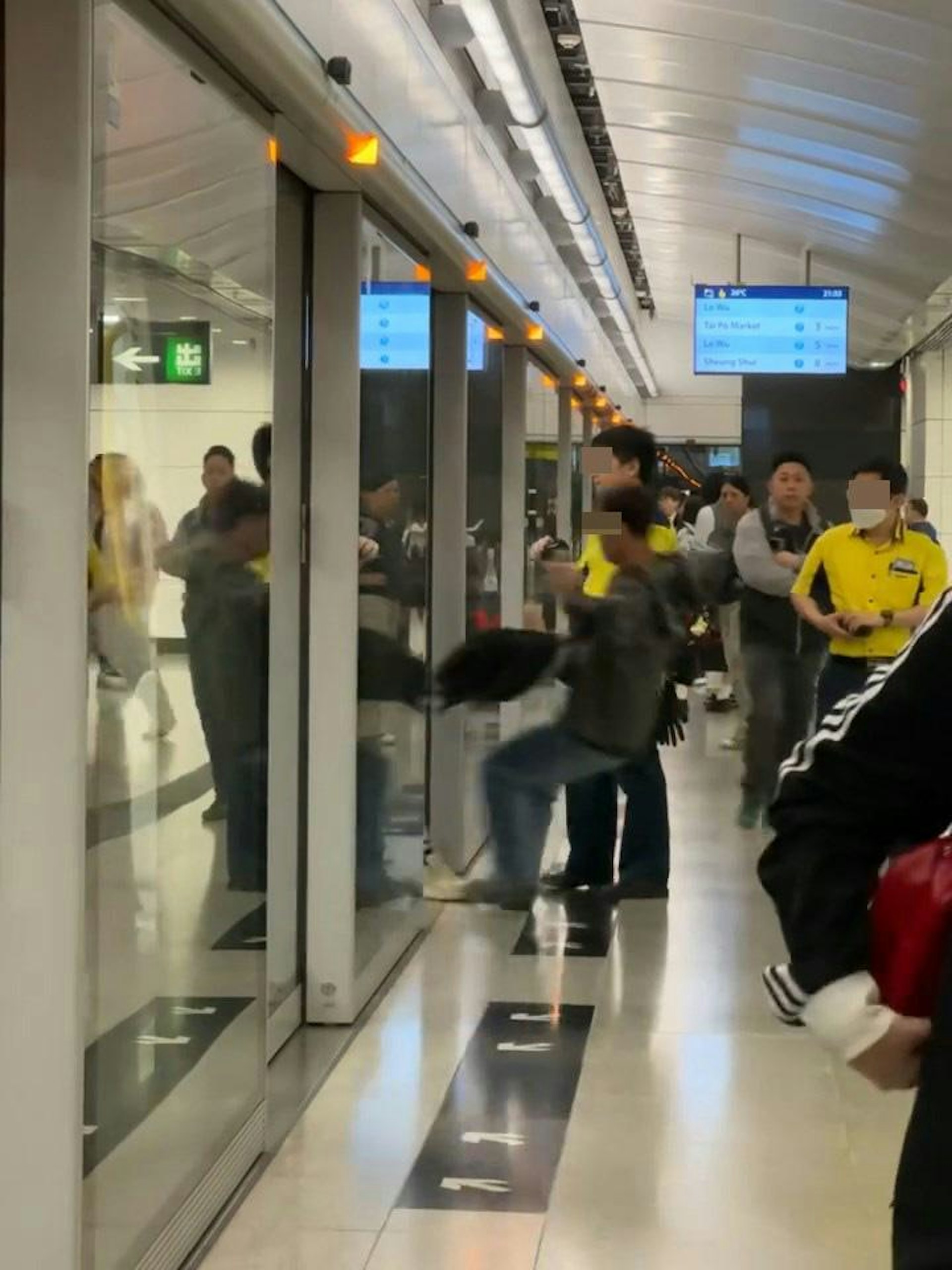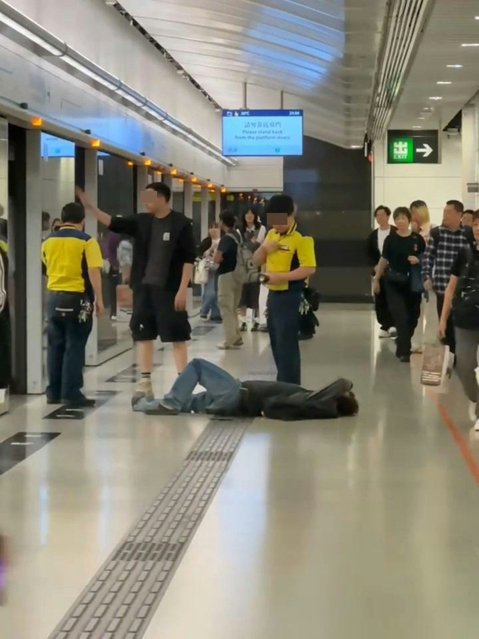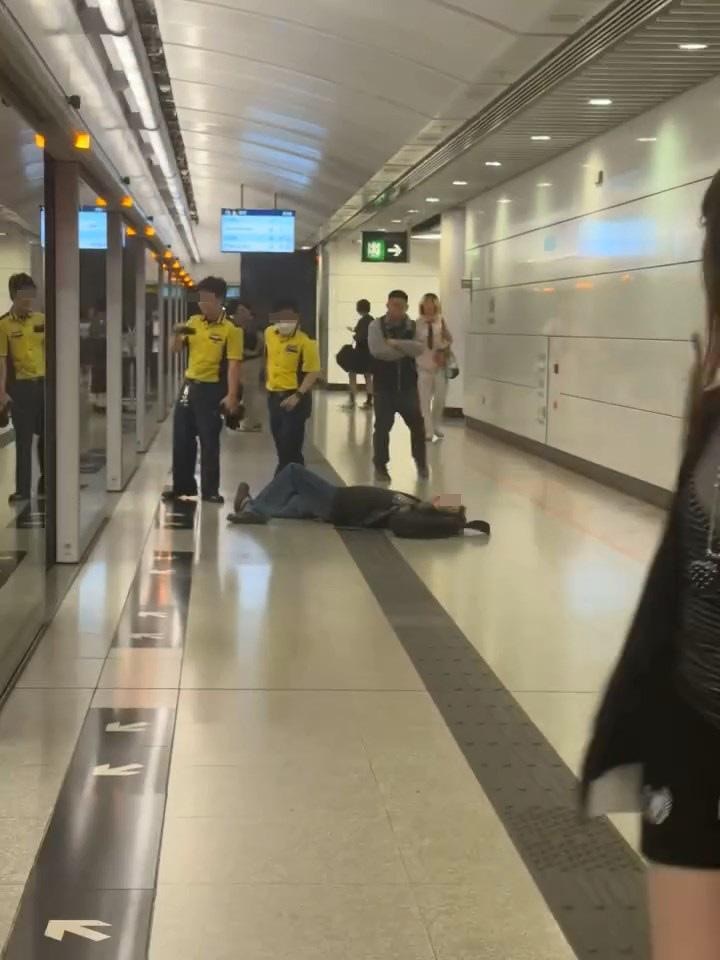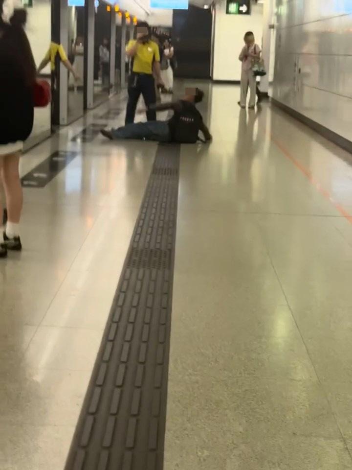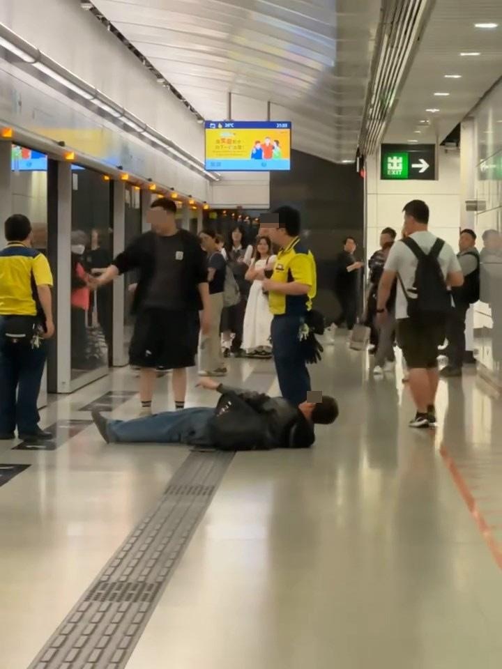 大叔再衝上阻擋車門關閉,突然現場傳出「嘭」一聲巨響,大叔疑被乘客一腳踢中心口向月台飛出,頭朝上倒在地上。