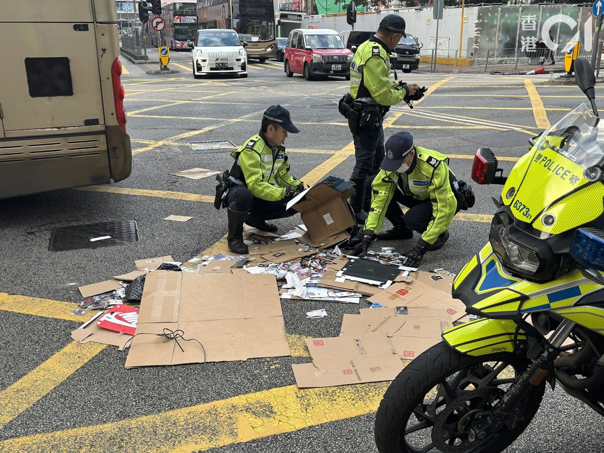 1 L; h: C6 a6 r) A# etvb now,tvbnow,bttvb現場遺下大堆紙皮,連同球星卡等,四散一地;警員在場執拾清理。(戴慧豐攝)