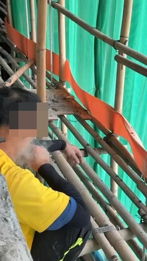 11月底有影片顯示,穿上橙黃色維修工人制服的男子,蹲坐在石屎上吸煙,煙霧彌漫,離棚架相當近,而他眼前就是綠色的圍網。未知影片何時拍攝,亦不確定地點是否大埔宏福苑。(Threads@jackyyy0728)8 s, \2 i! G+ v3 o: ~ ~9 K
