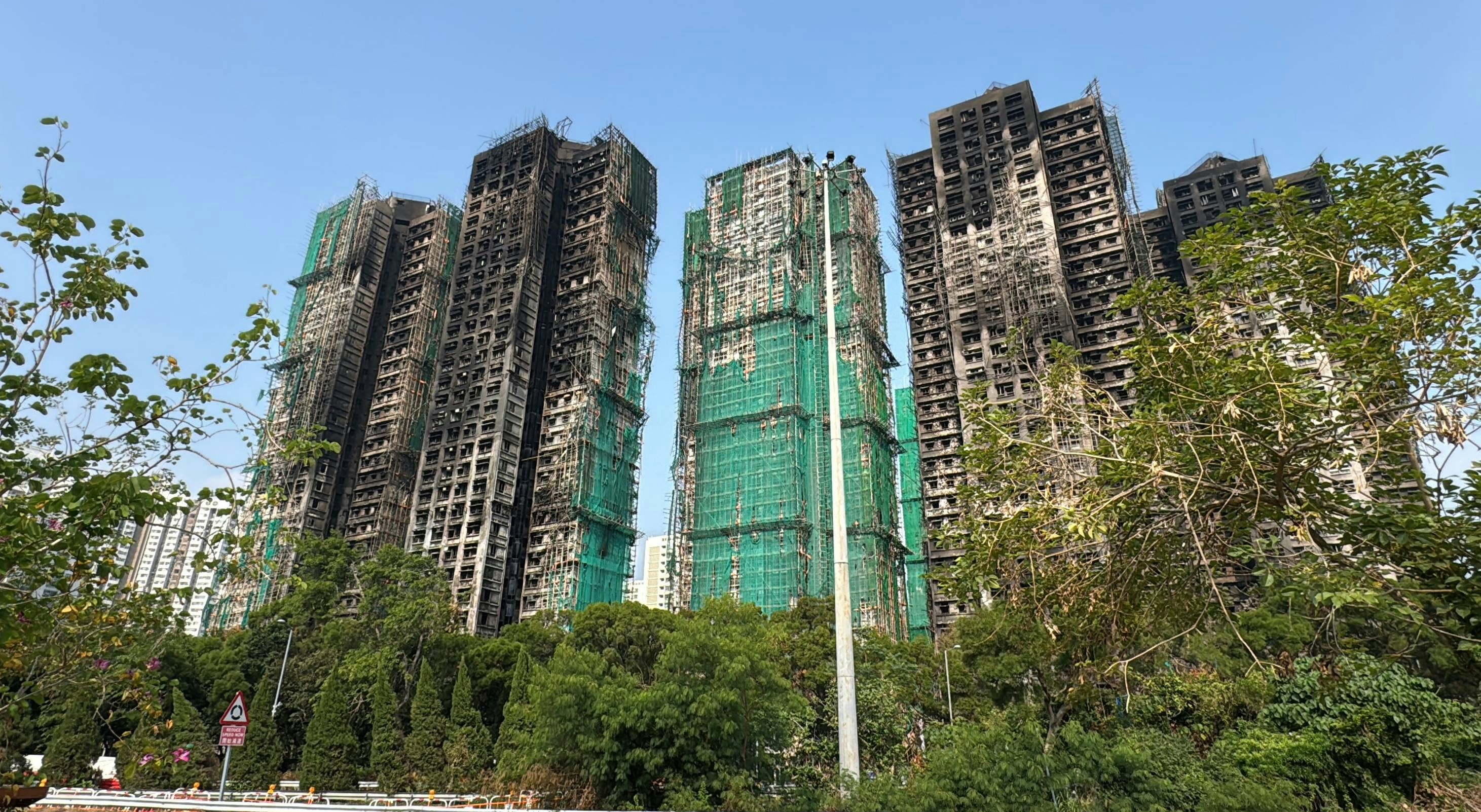 大埔宏福苑火災傷亡慘重,圖為12月9日現場情況。(左朗星攝)tvb now,tvbnow,bttvb) s# Z4 Z6 q/ e+ ?2 P9 ~