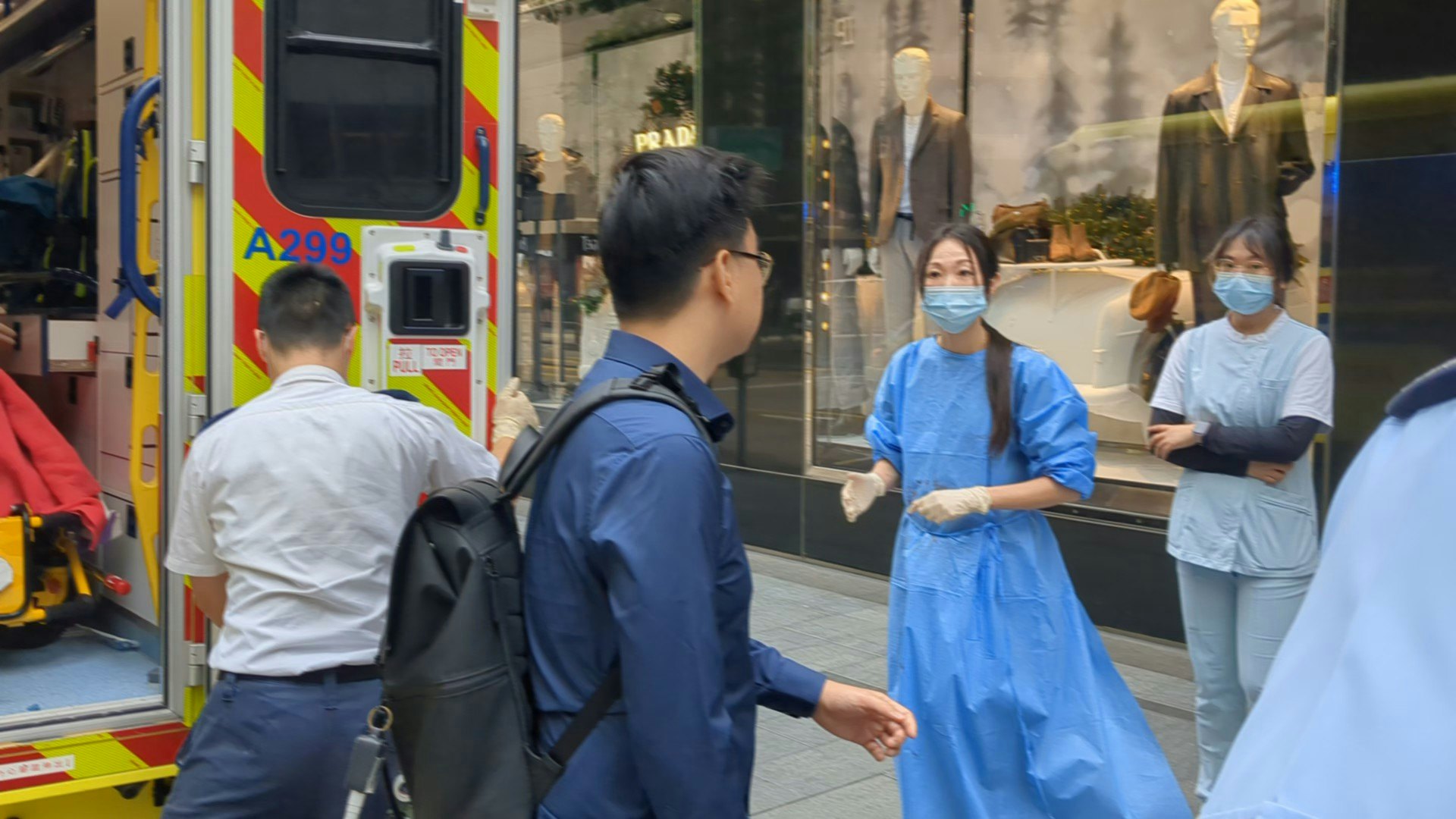 女子在歷山大廈的商場廁所內分娩,警方及消防員到場處理。(黃偉民攝)