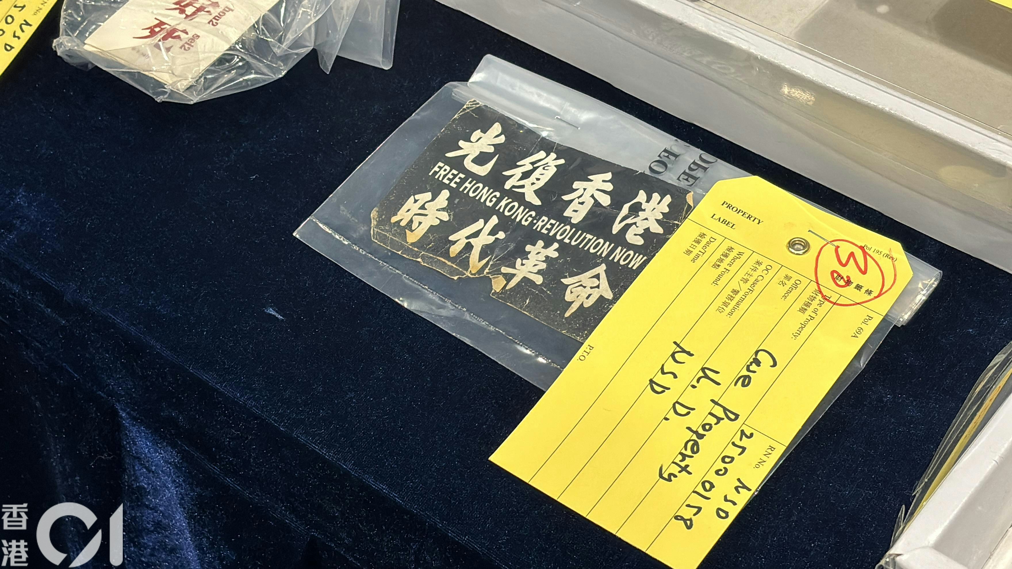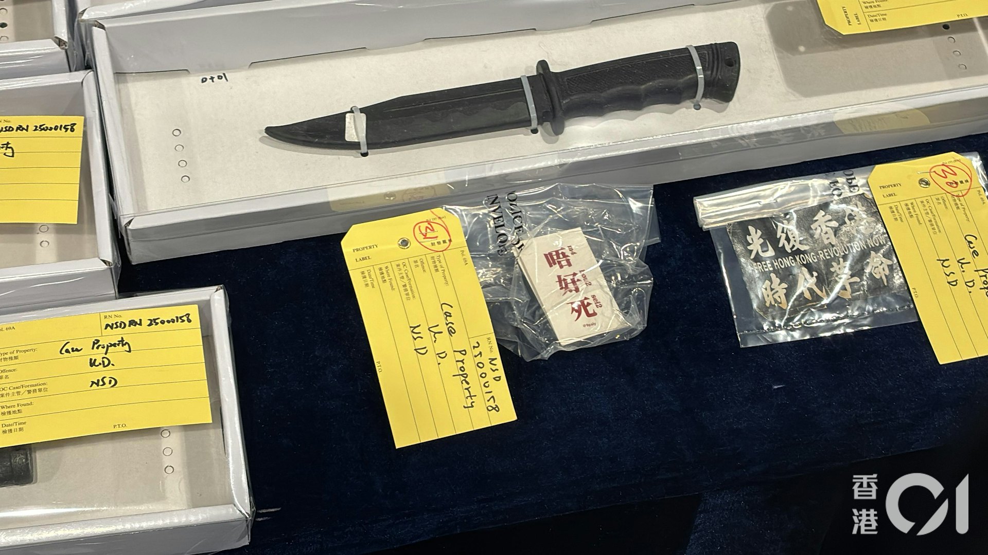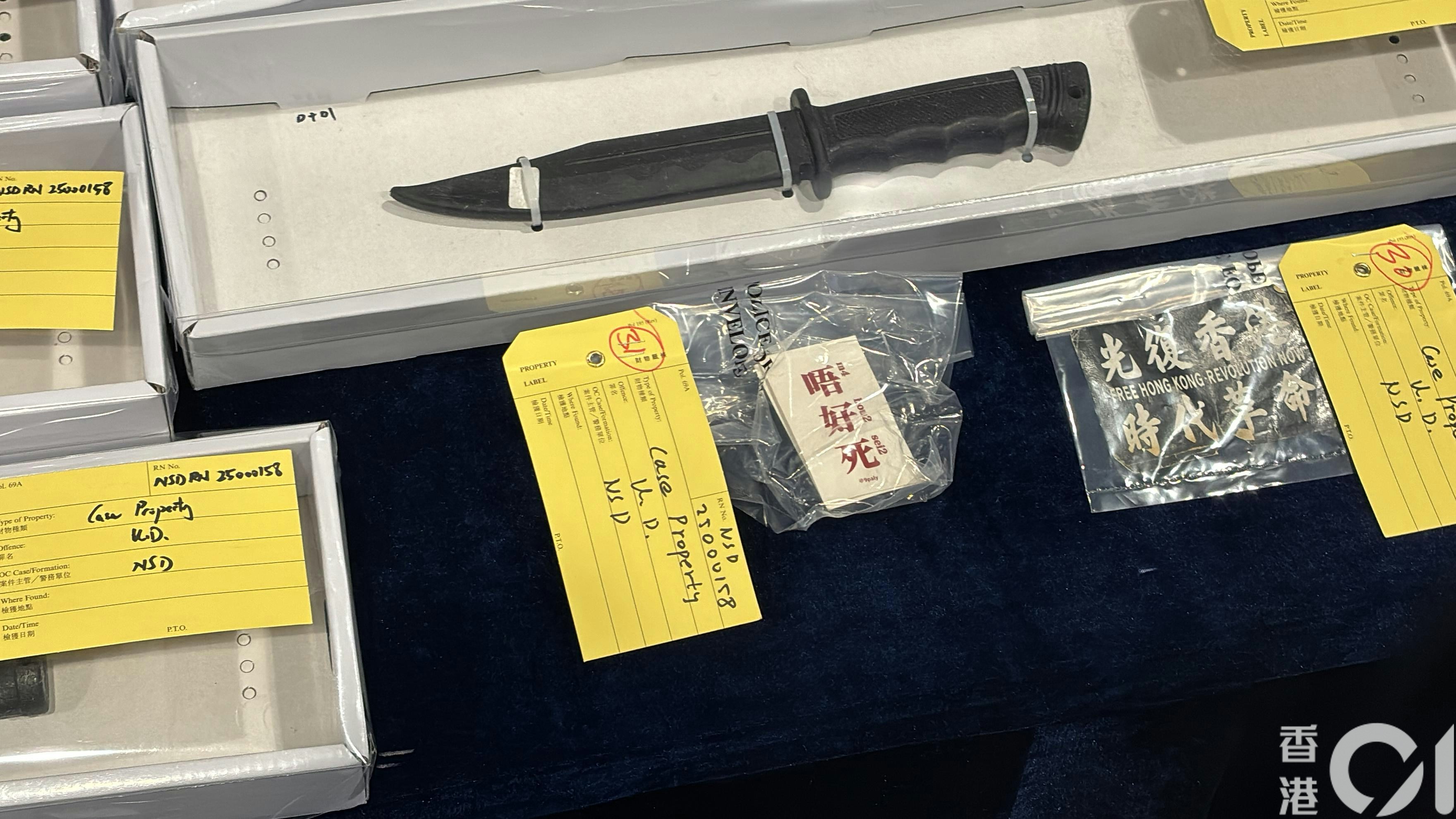 警方國安處以涉嫌「非法操練」拘捕9名男子,檢獲大批氣槍、刀劍、爆炸品及3D打印機,以及印有「黑暴」分子常用口號或貶損特區政府的繡章等。(陳浩然攝)