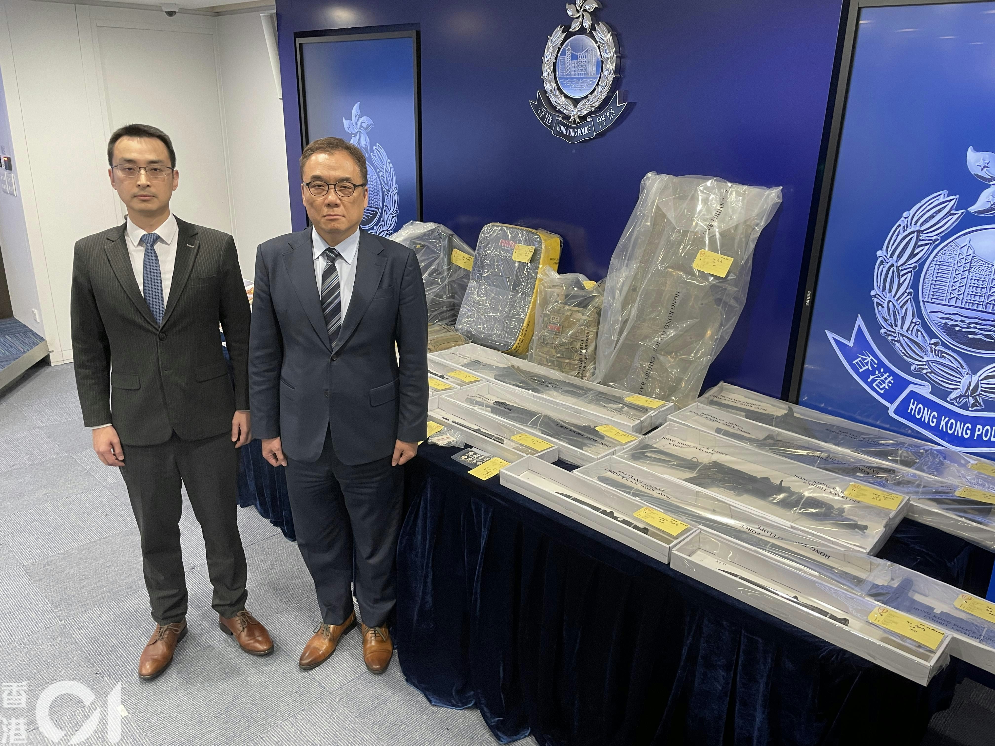 警方國安處以涉嫌「非法操練」拘捕9名男子,檢獲大批氣槍、刀劍和爆炸品。國安處總警司李桂華(右)和警司周學賢交代案情。(陳浩然攝)公仔箱論壇3 s' i# Q$ T0 L! S