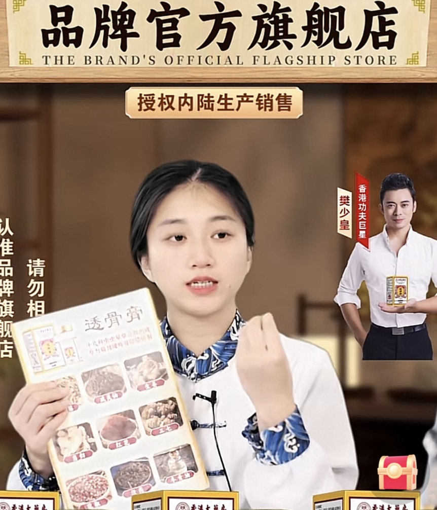 直播閒中,主播也是很誇張介紹這些「香港大藥房」產品,説到一款透骨膏時,稱「這款透骨膏是香港老品牌,世界冠軍都在用」、「透皮吸收,透到骨子裡幫助到您」,甚至還講起了故事「自1841年在香港成立以來……品牌見證歷史的變遷。」