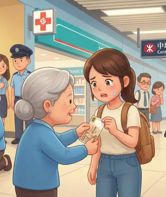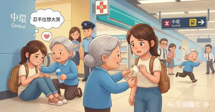 一名內地女生在中環港鐵站突發不適,一位藍衫阿婆即場陪伴近50分鐘,遞水照顧。AI 生成圖片os.tvboxnow.com2 J4 b( D# d! r, E0 o