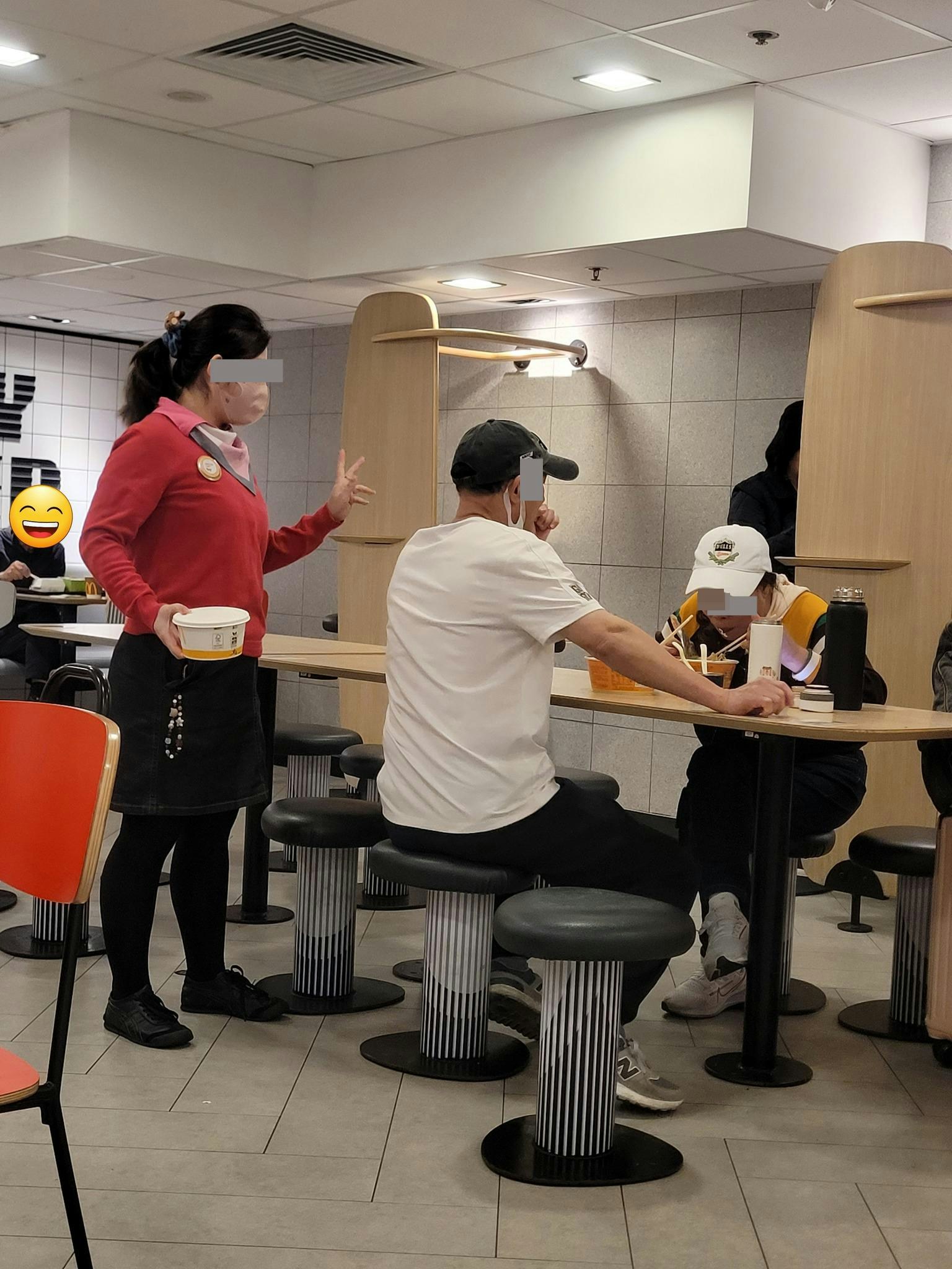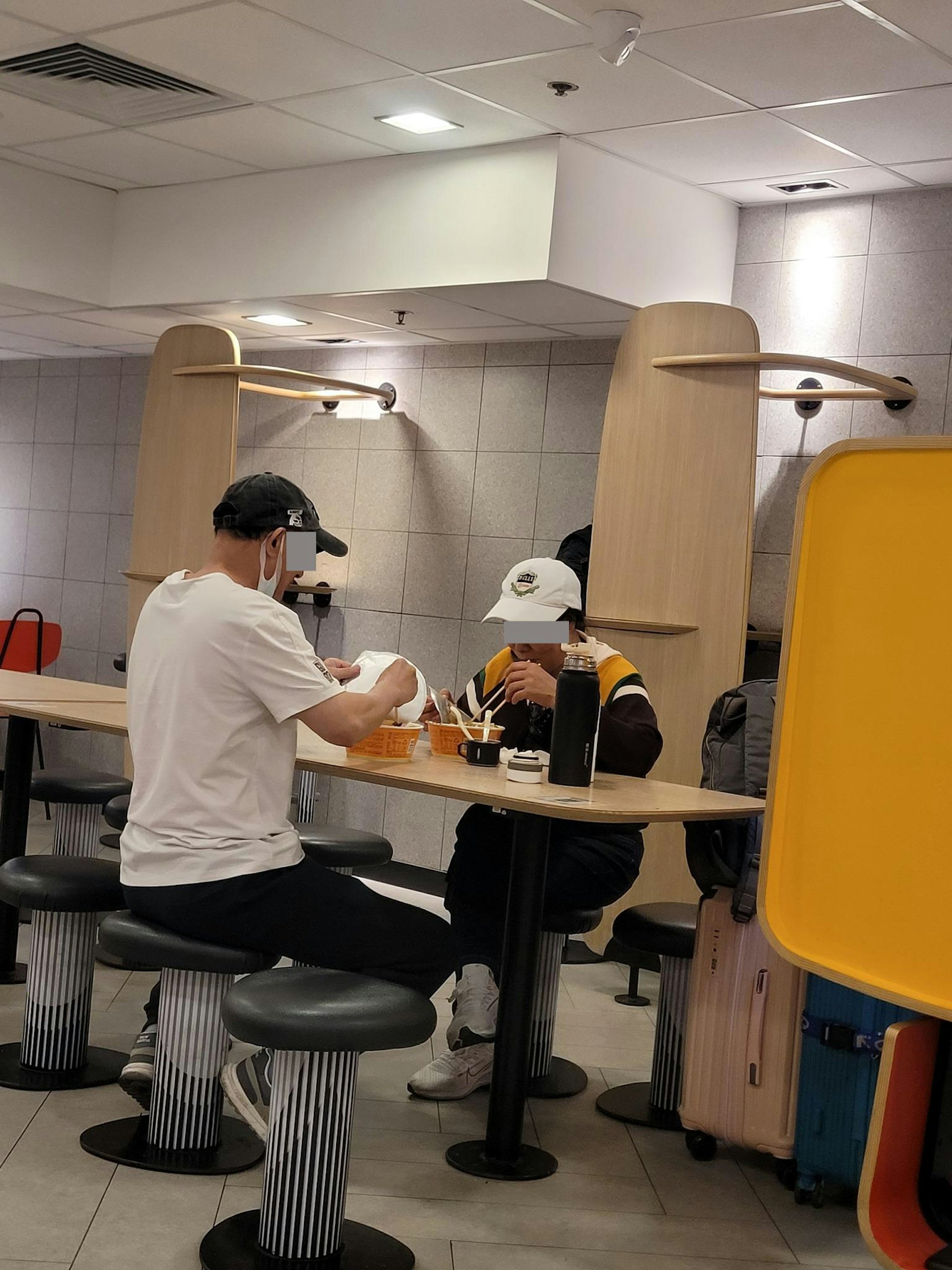 0 z) F" D4 {8 Q; ^4 A2 X1 j" h+ j有網民在Facebook群組「青衣街坊吹水會」上發相,指當時在12月18日上午11時,相片可見有一對男女在座位上食杯麵,桌上更放有自備的水樽,身旁有兩個行李喼及背包,看來似是旅客。而另一張相見有麥當勞女職員上前,似是在勸喻兩人。