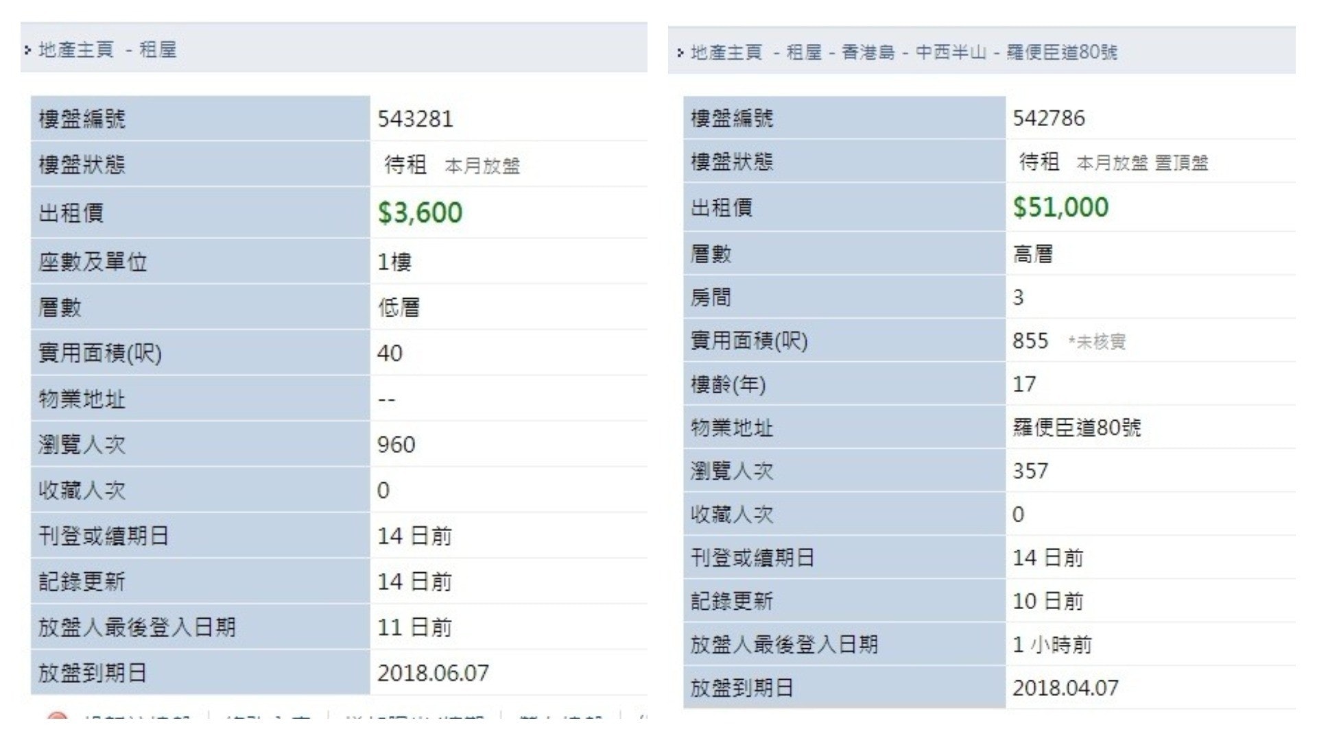 ' S' P1 ~2 V# T" p8 _tvb now,tvbnow,bttvb港島駱克道一間40呎的劏房(左),每月租金3600元,呎價高達90元;而西半山羅便臣道一個高層三房海景單位(右),實用面積855呎,租金51000元,呎價約60元。os.tvboxnow.com2 h& [; V4 ~9 F7 {