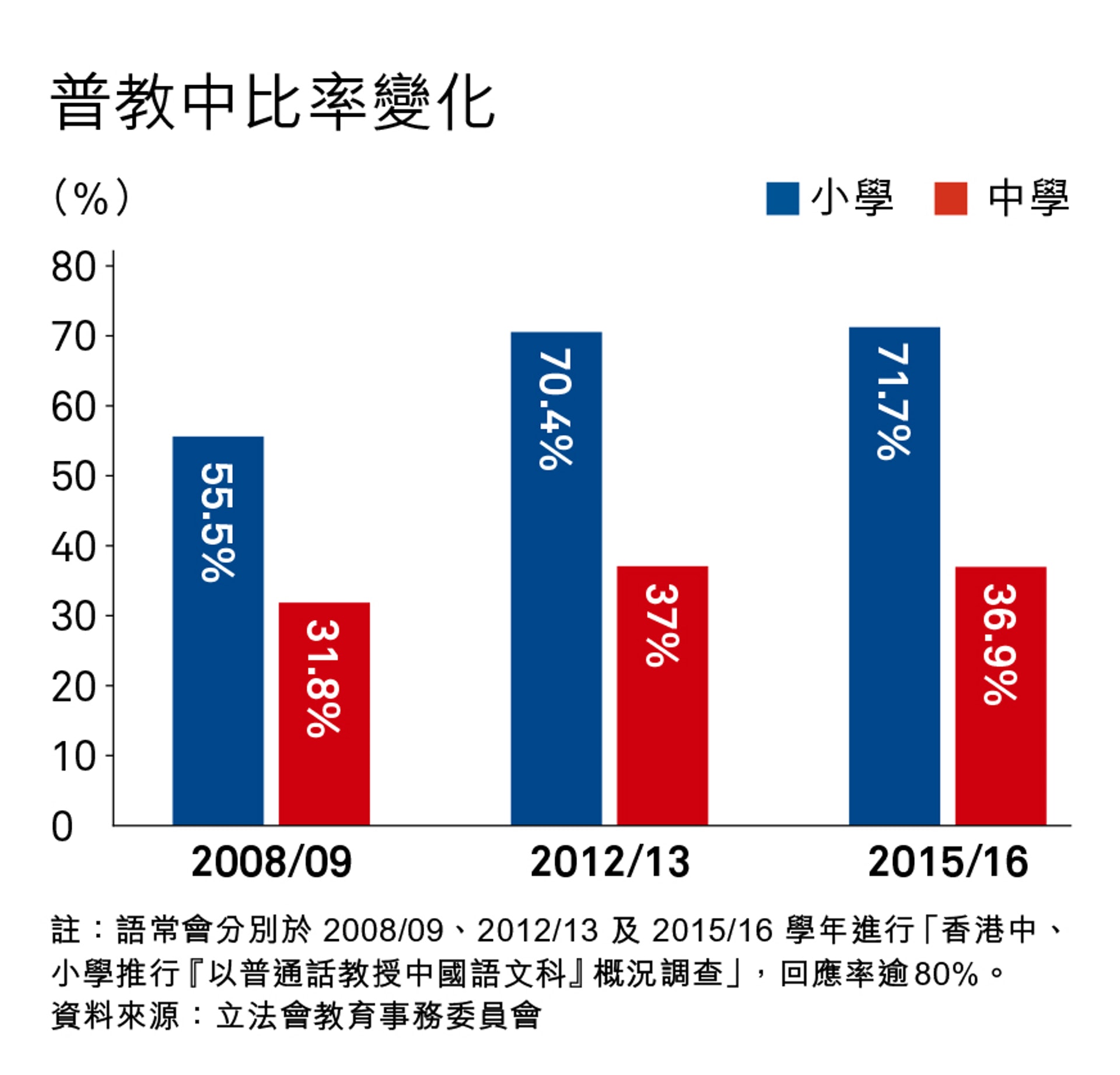 全面「普教中」 | 部分「普教中/廣教中」 | 全面「廣教中」 | | 小學 | 16.4% | 55.3% | 28.3% | | 中學 | 2.5% | 34.4% | 63.1% |