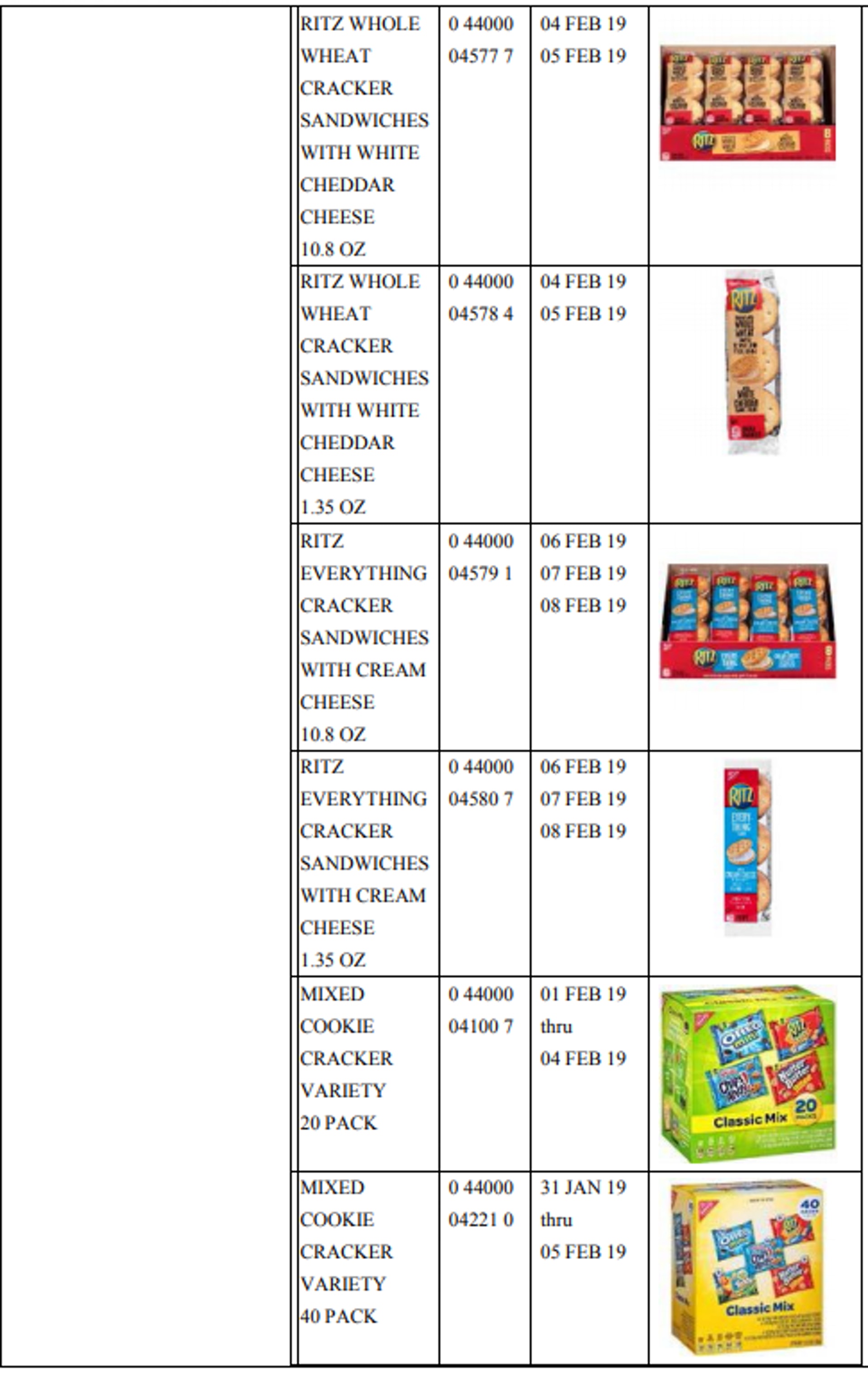 ; K4 G' y f- k* G0 G根據美國食品藥物管理局及Mondelēz Global LLC的公告所示,需要召回的產品有10多款,包括不同包裝的芝士夾心餅乾(Ritz Bits Cheese Cracker Sandwiches)、芝士夾心餅(Ritz Cheese Cracker Sandwiches)等,產品食用有效日由2019年1月14日至4月13日不等。公告中又指,現階段未收到感染投訴,回收行動只屬預防措施。