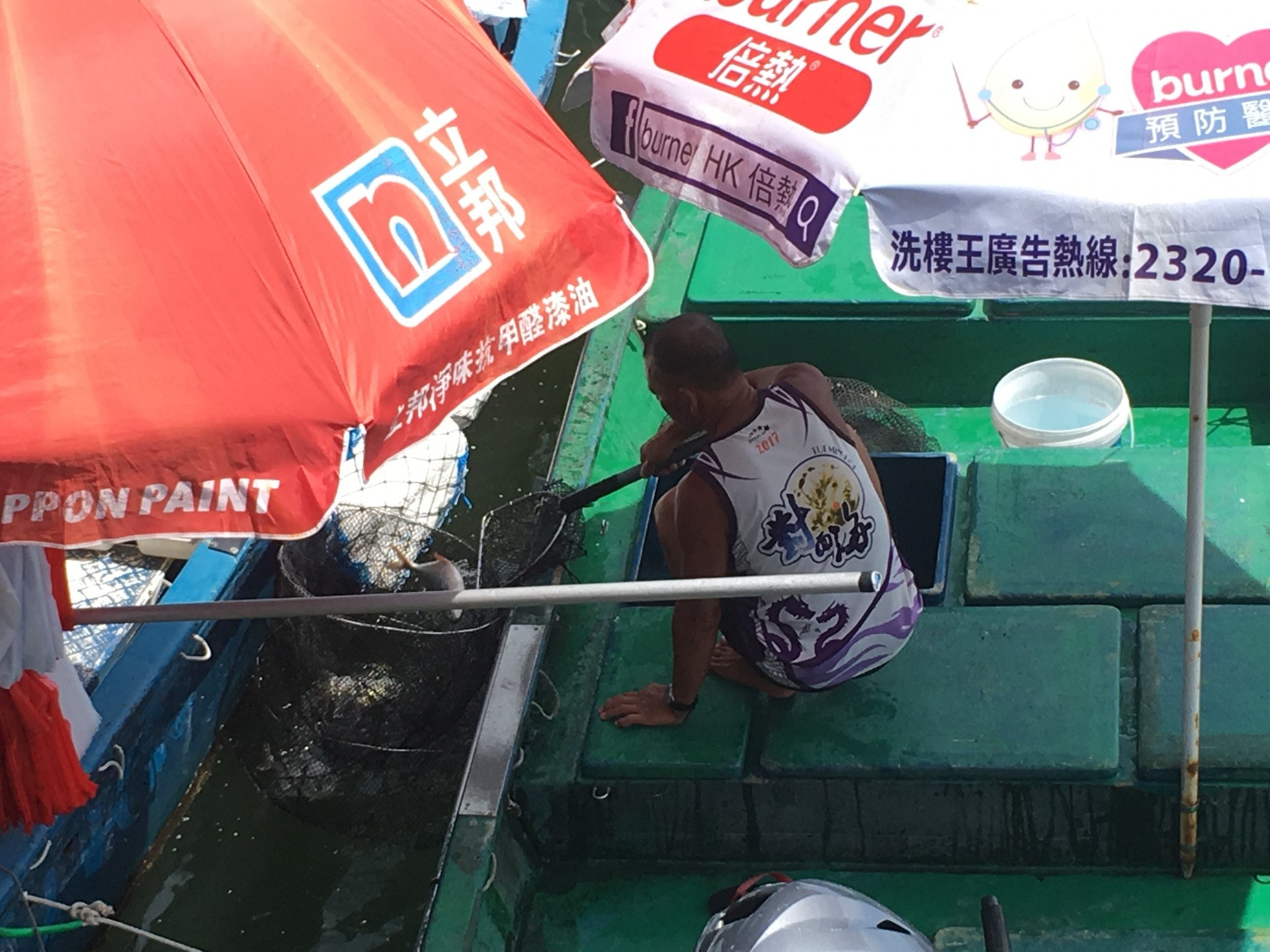 ! \5 [6 d e. t5 \4 o" j* |颱風山竹毀污水廠污染西貢海水,但記者現場所見,約10檔漁船仍有使用近岸海水養魚。(鄭翠碧攝)