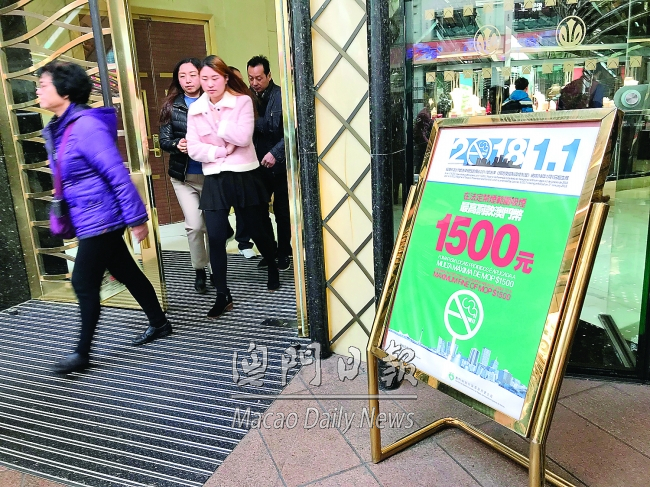 【本報消息】本澳控煙工作進入新里程,經修訂出台的“新控煙法”規定即日起全澳娛樂場室內全面禁煙,無論中場或貴賓廳,除獲得許可設置的吸煙室外,娛樂場內所有吸煙區和舊有吸煙室均被取消。截至昨日,全澳共三百七十八間吸煙室獲批,其餘娛樂場可繼續提出申請。提醒居民及遊客,違法吸煙可被處罰。