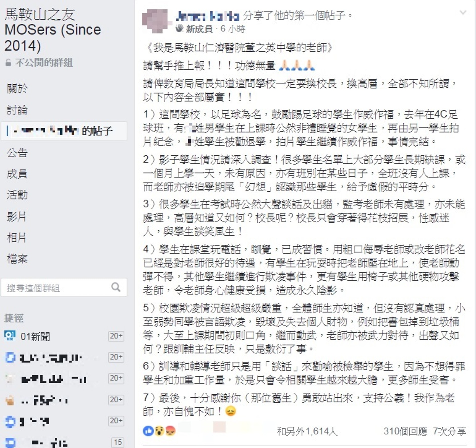 * S" f* C3 ?; j `; e: {2 K: Mos.tvboxnow.com自稱是馬鞍山仁濟醫院董之英中學老師的撰文者,批評校內欺凌風氣嚴重;又稱校內有大量「影子學生」。(馬鞍山之友 MOSers (Since 2014)截圖)TVBNOW 含有熱門話題,最新最快電視,軟體,遊戲,電影,動漫及日常生活及興趣交流等資訊。9 b+ l3 E/ A3 U+ A. [% s