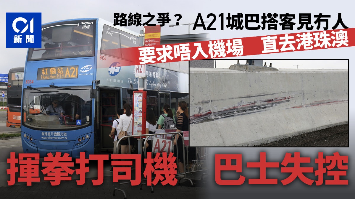 城巴發言人指,今日早上6時45分,一輛路線A21的巴士往機場方向行駛,途徑順輝路近港珠澳人工島時,一名乘客跟車長說車上已沒有其他乘客,認為巴士應直接駛往人工島,不用經過機場。兩人就此事起爭執,其間乘客揮拳打向司機,巴士失控撞向路壆。車長隨即通知公司及報警求助。城巴公司嚴厲遣責該名乘客行為,並會配合警方調查。