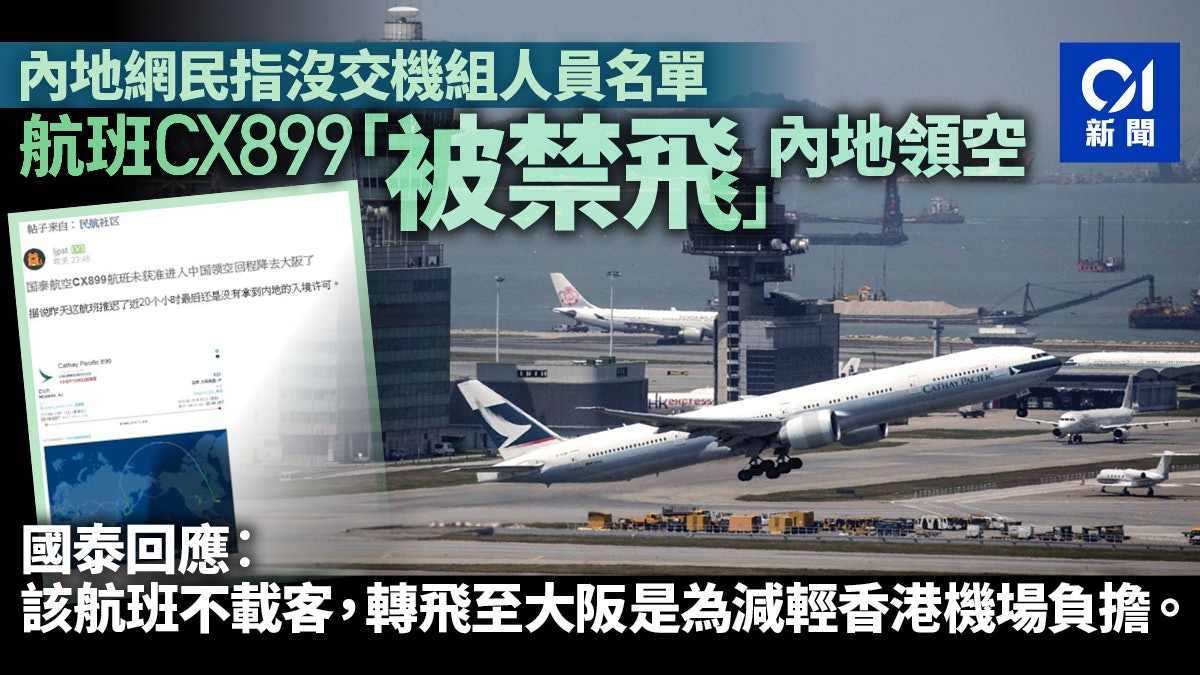 6 U# |6 _7 h+ u中國內地民航局上周五(9日)向國泰航空發出重大航空安全風險警示,當中包括規定國泰必須向內地提供所有飛往內地航班的機組人員身份資料。內地民航討論區及微博近日流傳,原定於周日(11日)由紐約飛往香港的CX899航班,資料顯示該班航機轉降至大阪,有網民聲稱該航班沒有提交機組人員名單,因而被禁途徑中國領空。