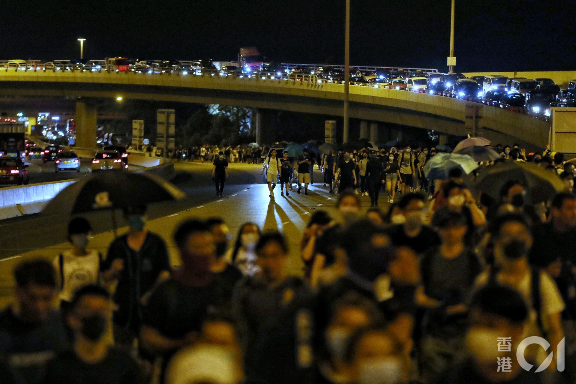 【19:28】北大嶼山公路,有傳後方有十輛警車將從後駛至,示威者開始離開路肩、霸佔馬路面共三條行車線,望爭取更多時間令其他人離開,有人一度奔跑。