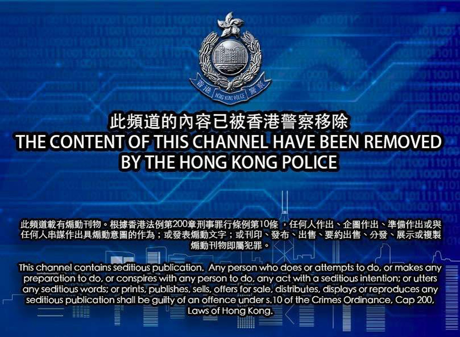 TG頻道「開掛之達人」的內容已被警方移除,警方在頻道內發出上述圖片以作通知。(網上圖片) |