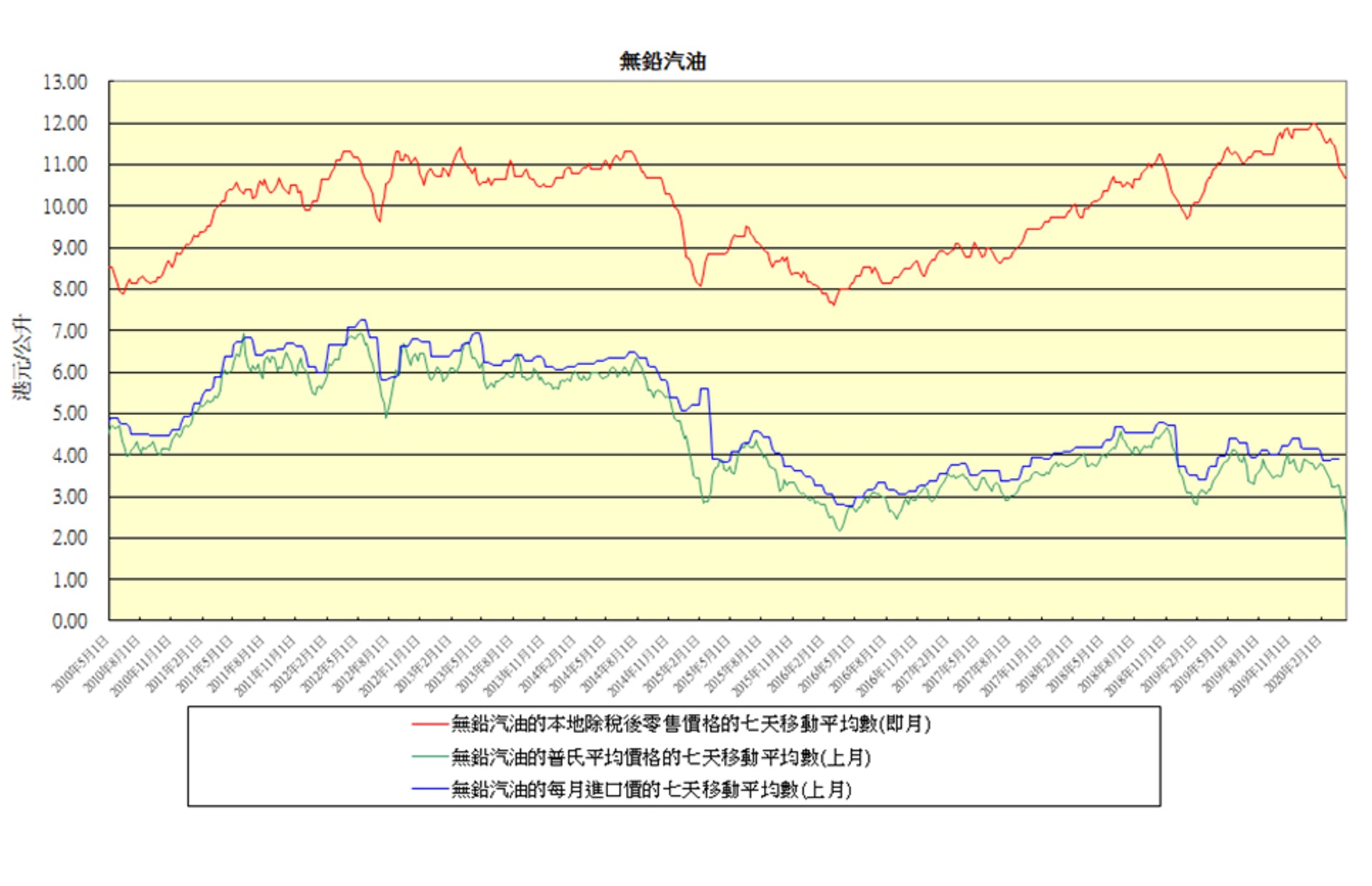 根據環境局資料顯示,2020年2月1日無鉛汽油的普氏平均價格為每公升逾2元,同期無鉛汽油進口價則為每公升約4元,但本地無鉛汽油除稅後零售價格則約為每公升約11元。(環境局網頁)os.tvboxnow.com- h+ j" R7 d8 E0 q" P, q) v
