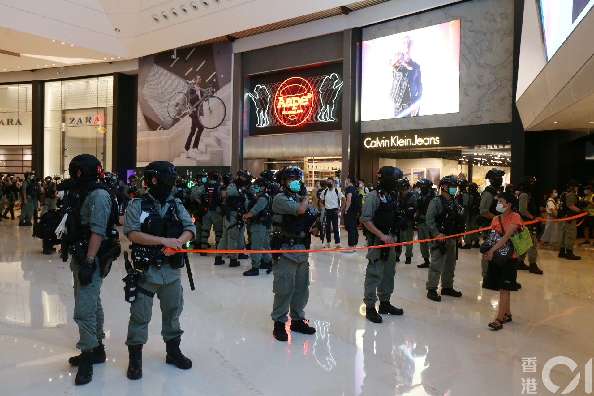 下午約3時15分,大約100名速龍小隊、防暴警員進入商場,並且架起橙色封鎖線,商場內多間店舖立即落閘。(鄧栢良攝)os.tvboxnow.com% _/ E' D1 f' E* r, ~6 ?