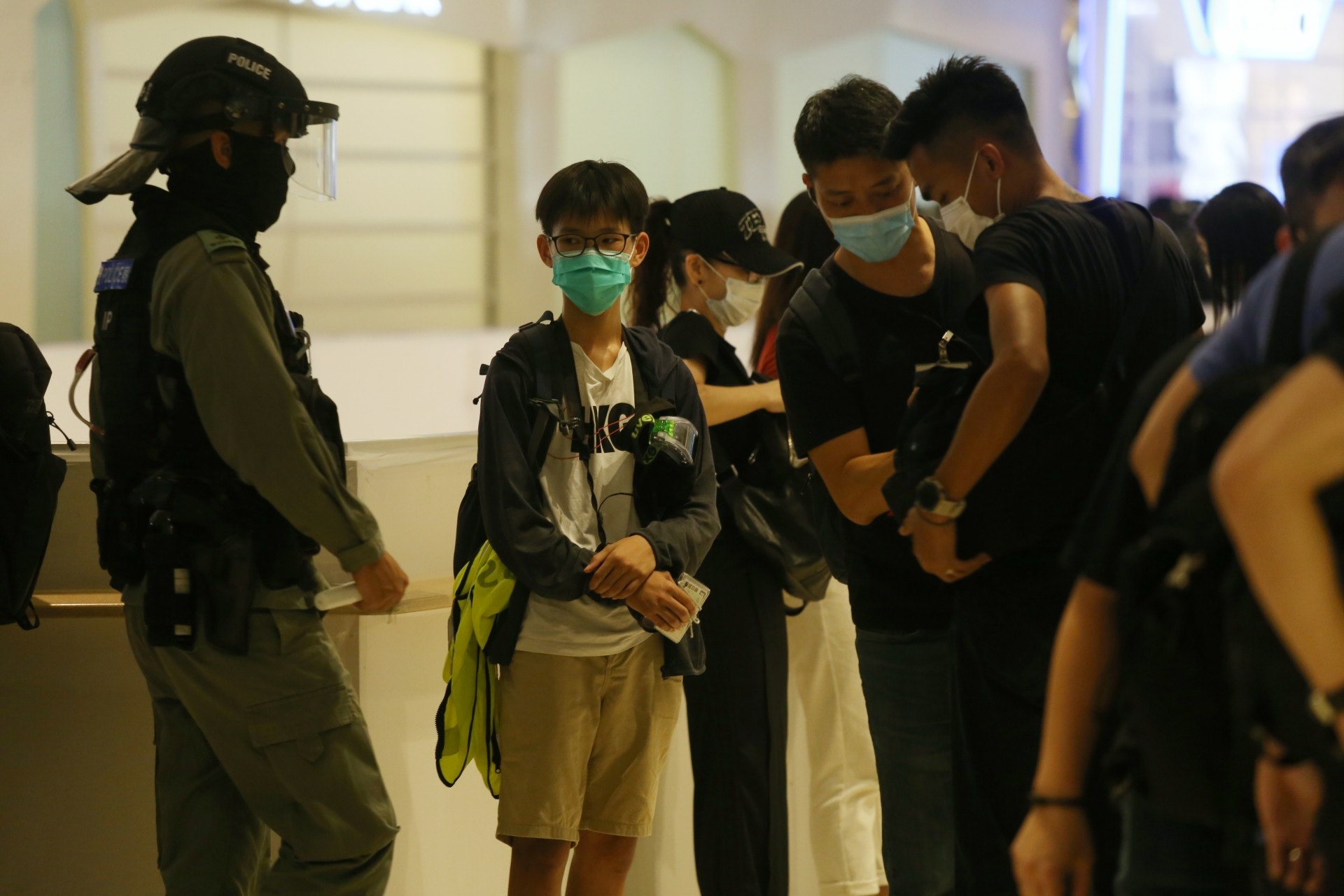 警員進入商場截查多人,其後將最少12人鎖上索帶帶走,一名12歲網媒男記者同被帶返警署。(鄧栢良攝)