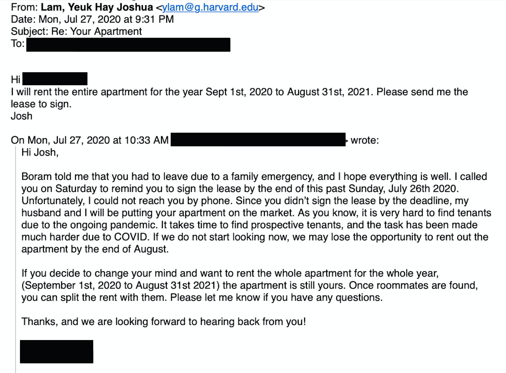 業主於7月27日向林約希發電郵,指對方未有在前一日(7月26日)的限期前,簽回下一年度的租約(2020年9月1日至2021年8月31日),詢問他是否繼續租用該單位,否則便會將單位放租。根據電郵紀錄,業主當日上午10時33分發電郵到林約希的哈佛大學電郵,指在7月26日曾致電給林但未能接通,假如林繼續租用單位就會預留單位給他。林約希同日晚上9時31分回覆電郵表示,會租用單位一年,並著業主將租約傳給他。" X0 S2 \- p* D' H% U6 ]2 ]) K L