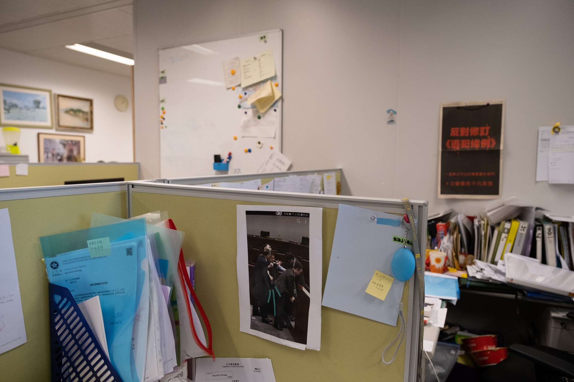 9 Q6 U$ G% U% j0 w6 E許智峯在離任立法會議員前最後一日,收拾辦公室的物品。(梁鵬威攝)