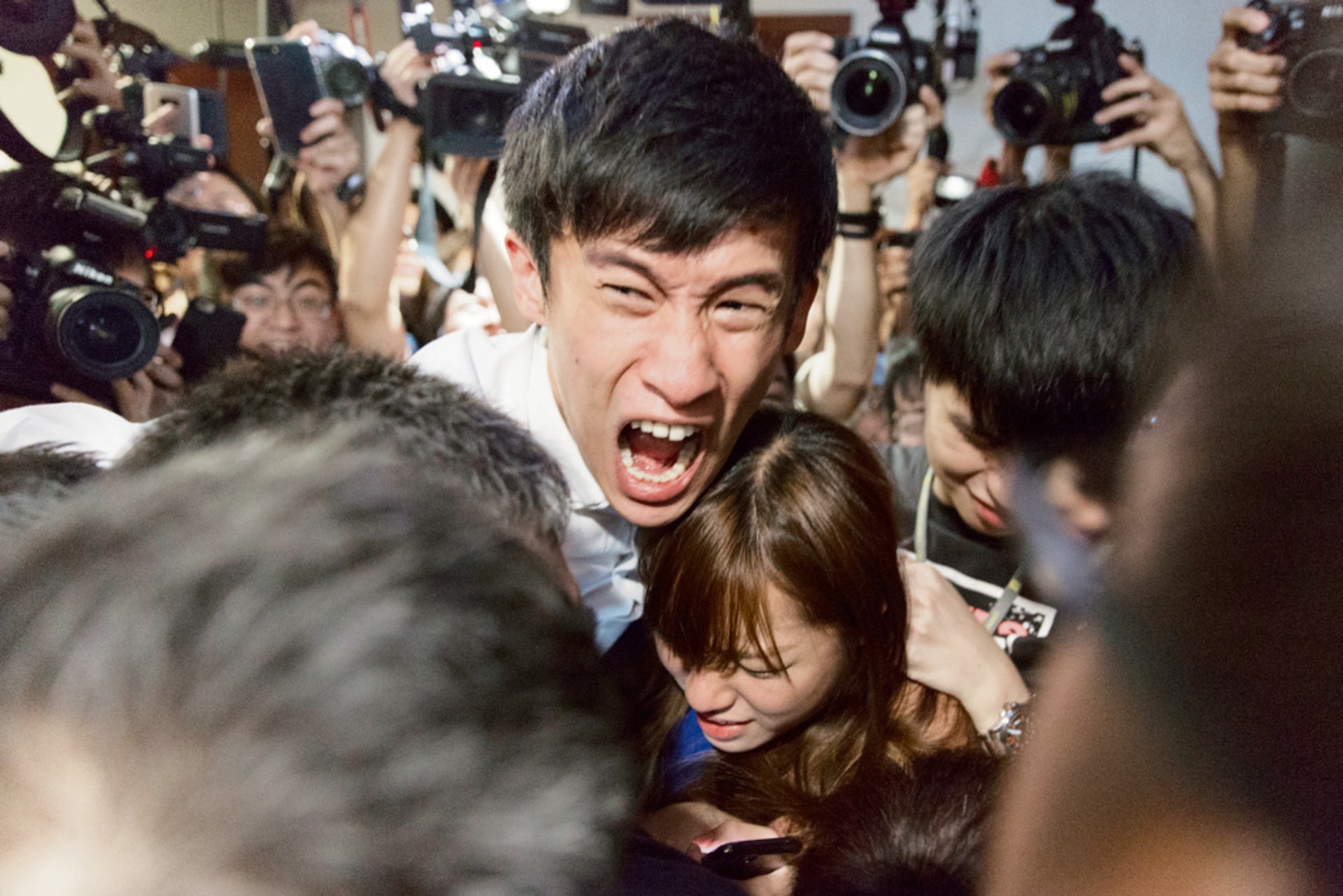 " W6 p) K2 I9 L% K青年新政的梁頌恆(右)及游蕙禎(中)後來被裁定非法集結罪成。(資料圖片/張浩維攝)