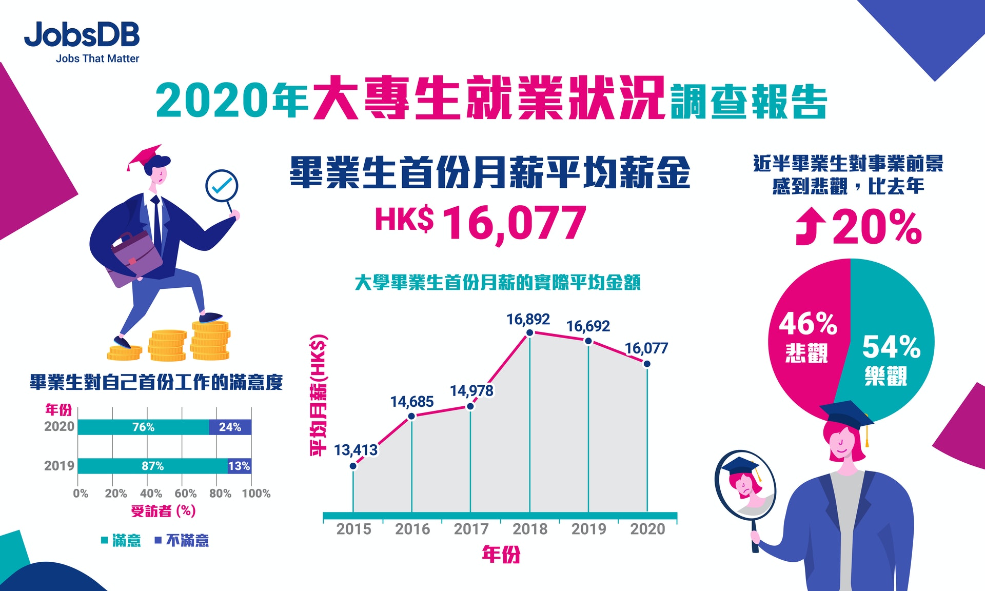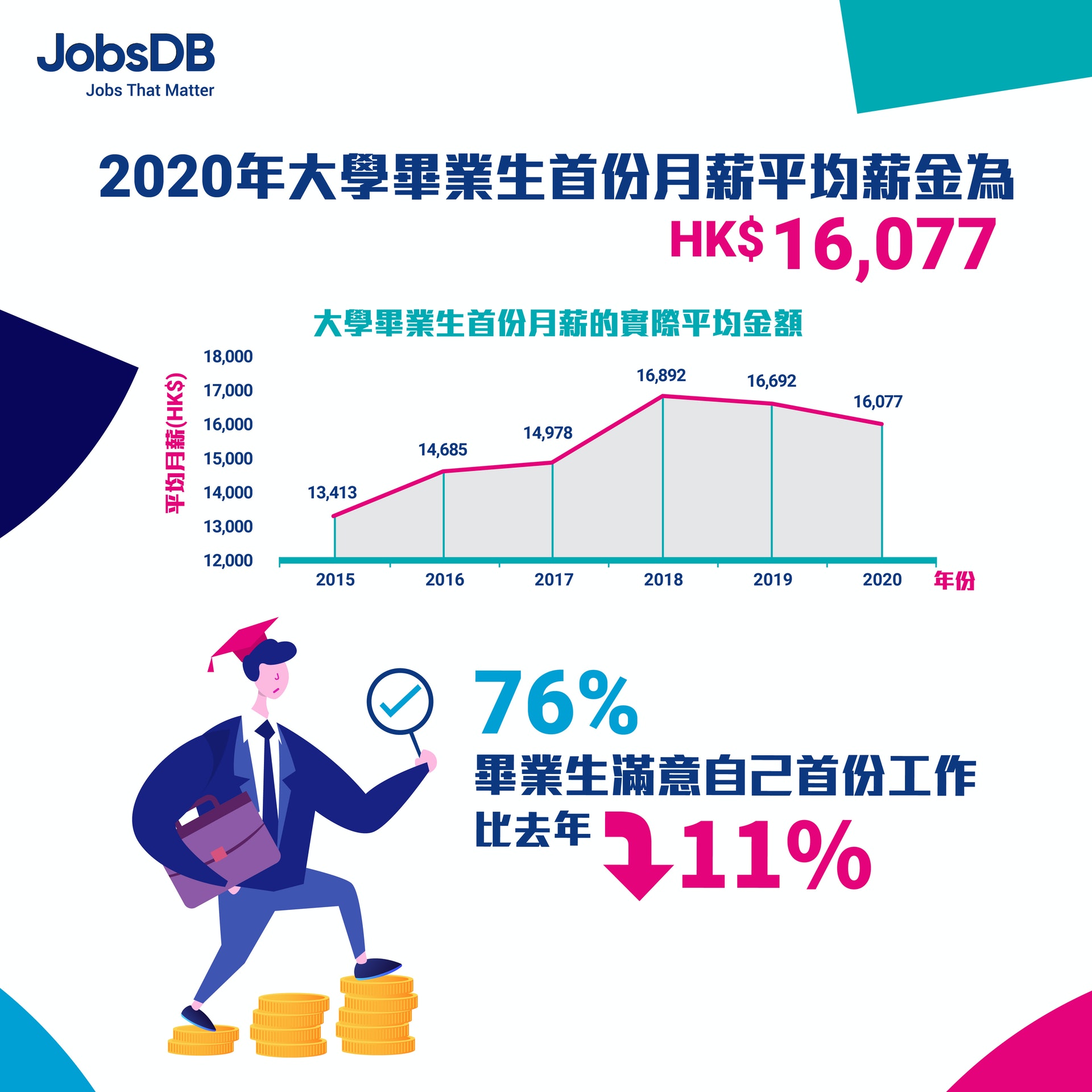 JobsDB 2020年大專生就業狀況調查報告,顯示應屆畢業生首份月薪,平均為16,077元。(JobsDB提供圖片)