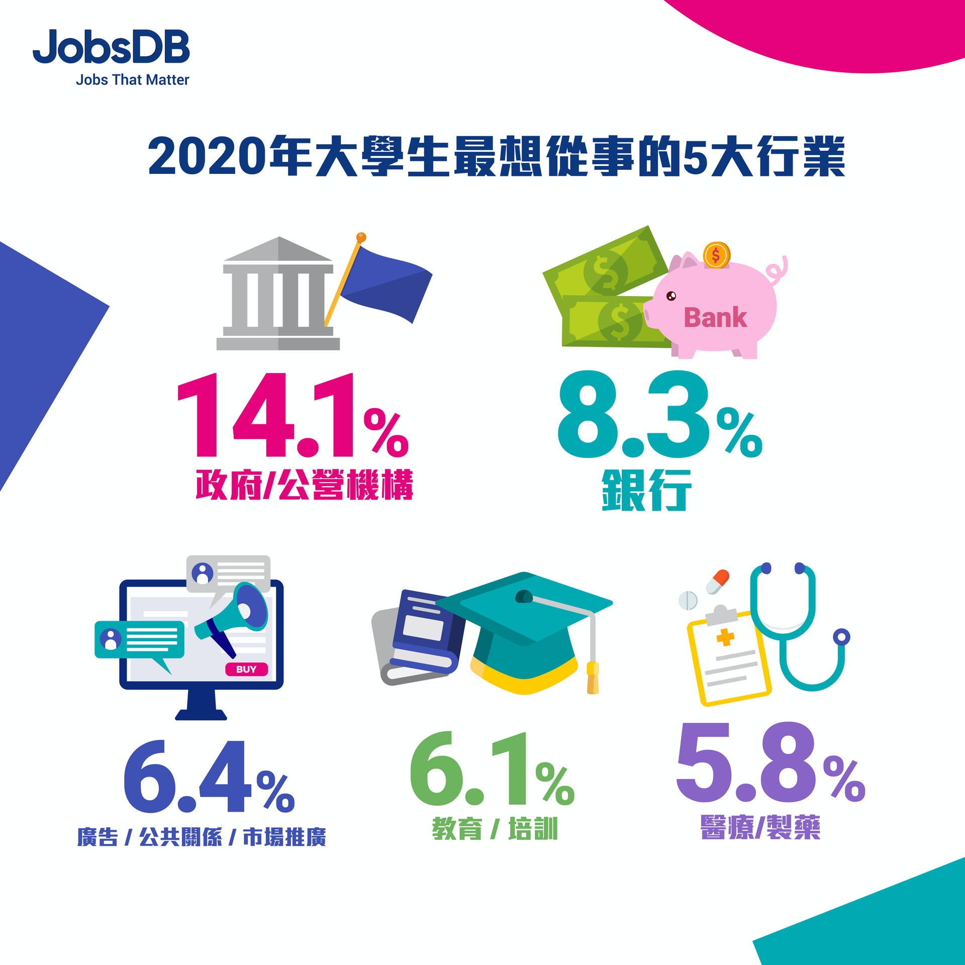 最多大學生想從事的行業為政府或公營機構,佔一成四,其次為銀行。(JobsDB提供圖片)+ h. Z( x" o" l- u) s+ X! q