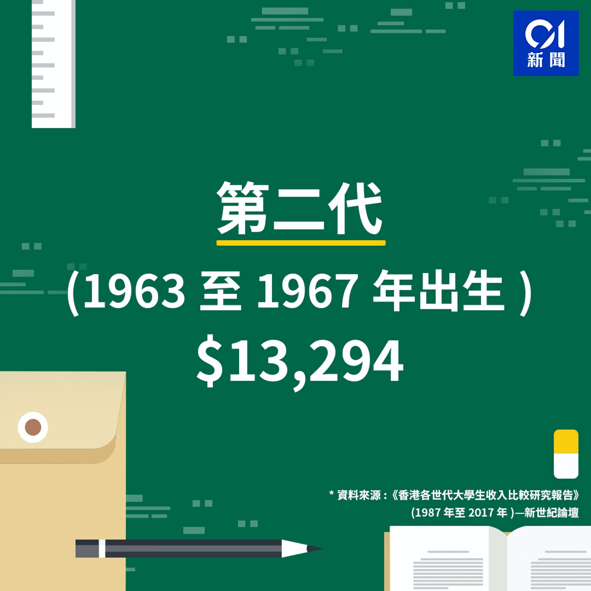 調查以5年為一代,按綜合消費物價指數調整薪金,第一代大學生未能提供相關數據。(香港01製圖)tvb now,tvbnow,bttvb' J( V2 i8 X) c; O9 J9 F5 \5 C/ y( V
